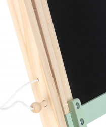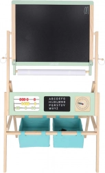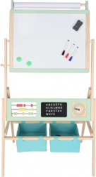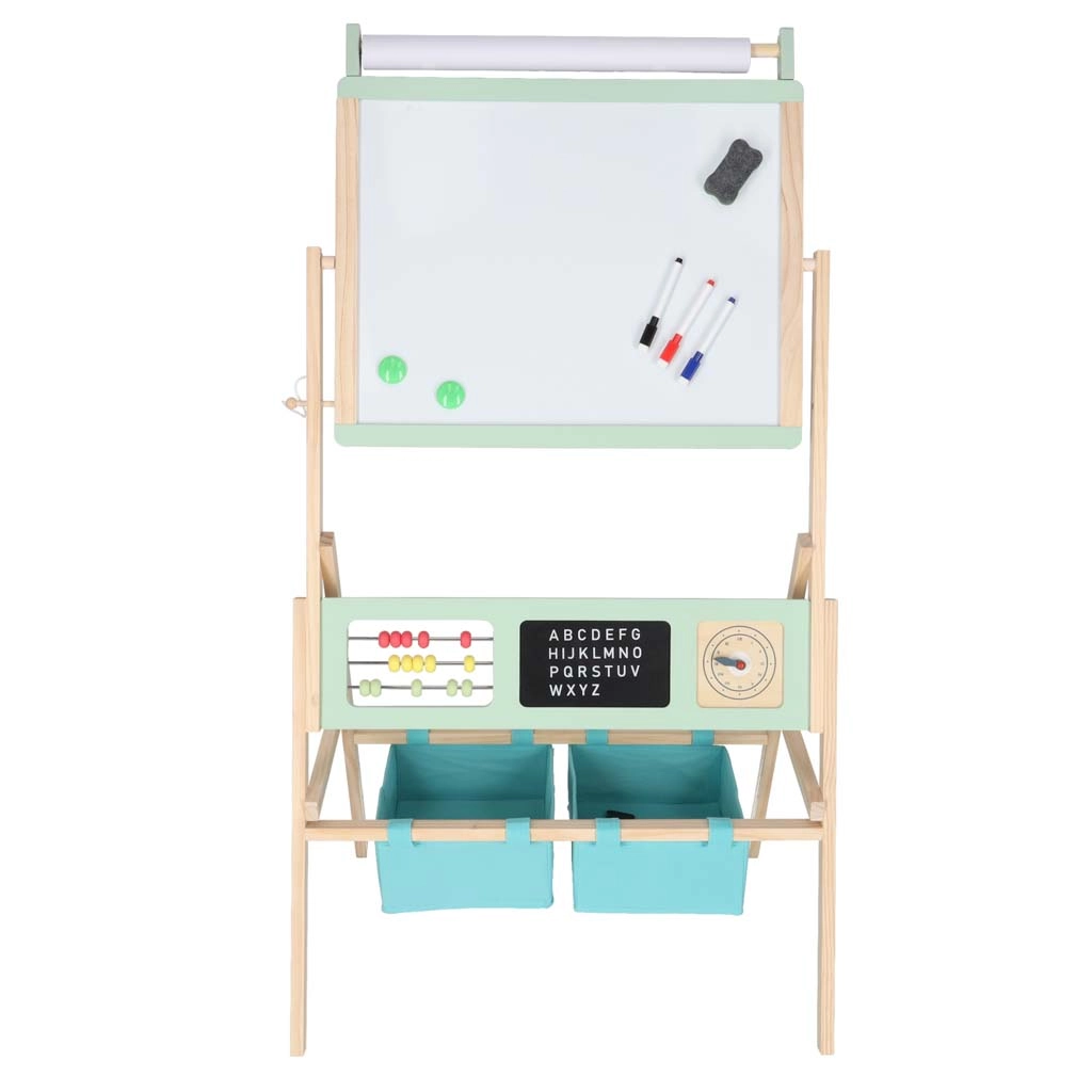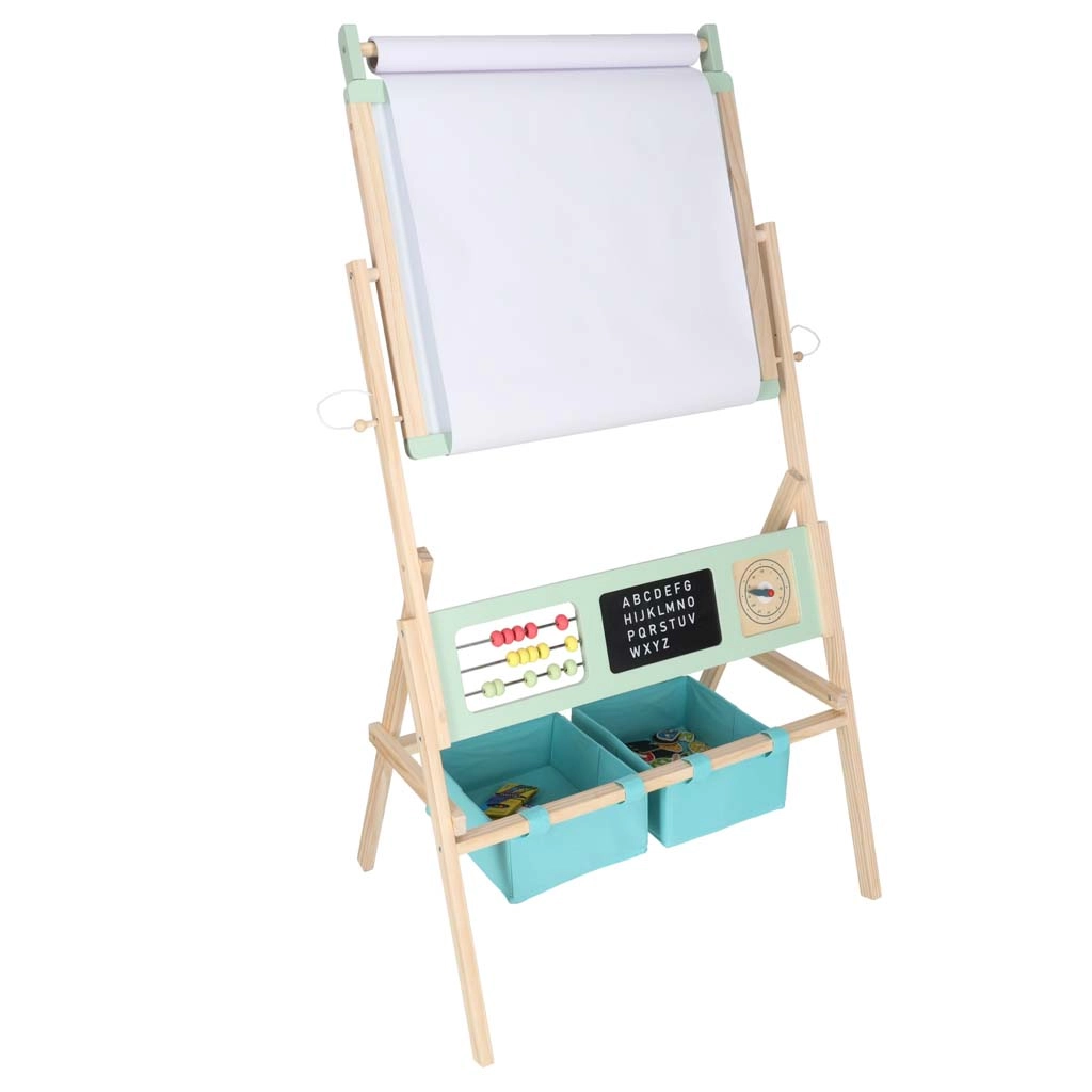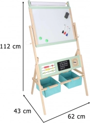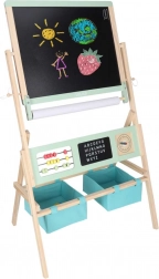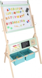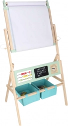 A fa szerkezet stabil és tartós, a két textil rekesz minden szükségest kéznél tart. A készlet tartalmaz krétákat, zsírkrétákat, mágneses filceket, törlőszivacsot és mágneseket – csak bontsd ki és alkoss.