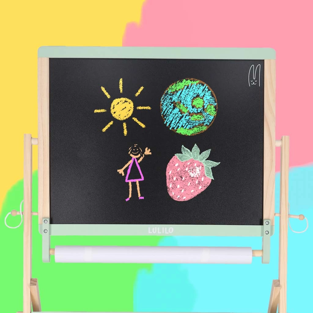 Egy tábla fekete krétás felülettel, szárazon törölhető mágneses fehér felülettel és papírtekercs tartóval a rajzoláshoz és festéshez.