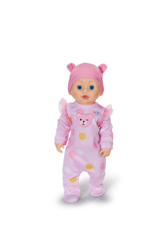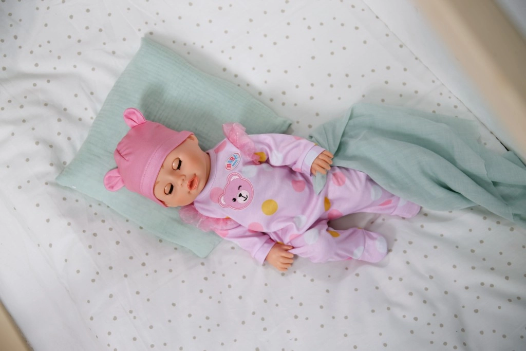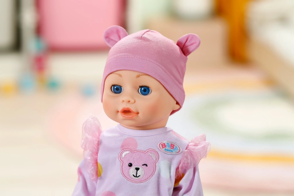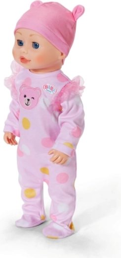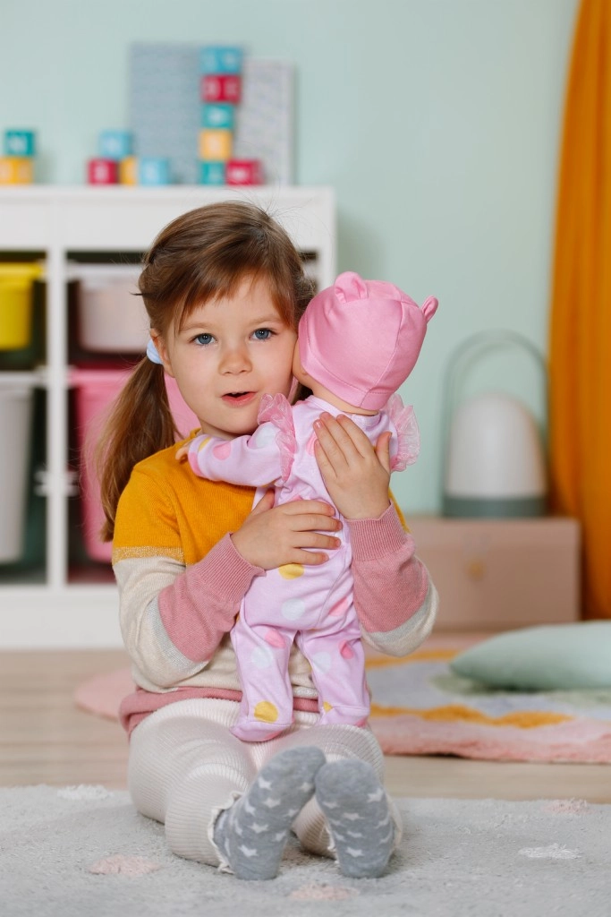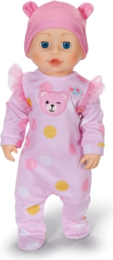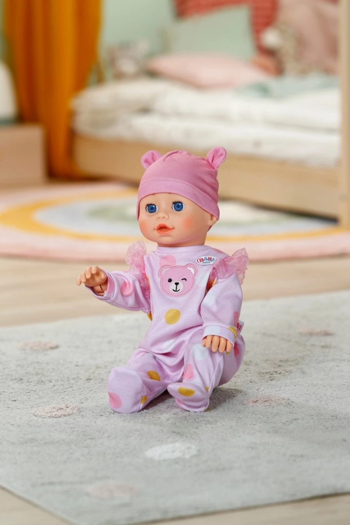Puha, rózsaszín, pöttyös rugdalózó és fülecskékkel díszített sapka, amelyek gyengéd hangulatot kölcsönöznek a játéknak.
