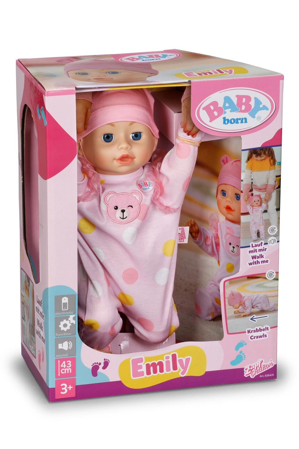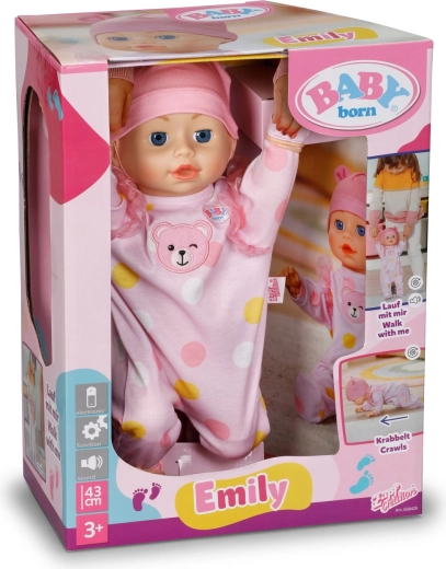 Fedezd fel a mozgás örömét a BABY born Emily 43 cm babával, amely járni és kúszni is tud. A valósághű mozdulatoknak, a puha testnek és a barátságos arckifejezésnek köszönhetően remek társa az aktív játéknak otthon és a szabadban. Támogatja a koordinációs képességeket, a fantáziát és a közös játékot a barátokkal.