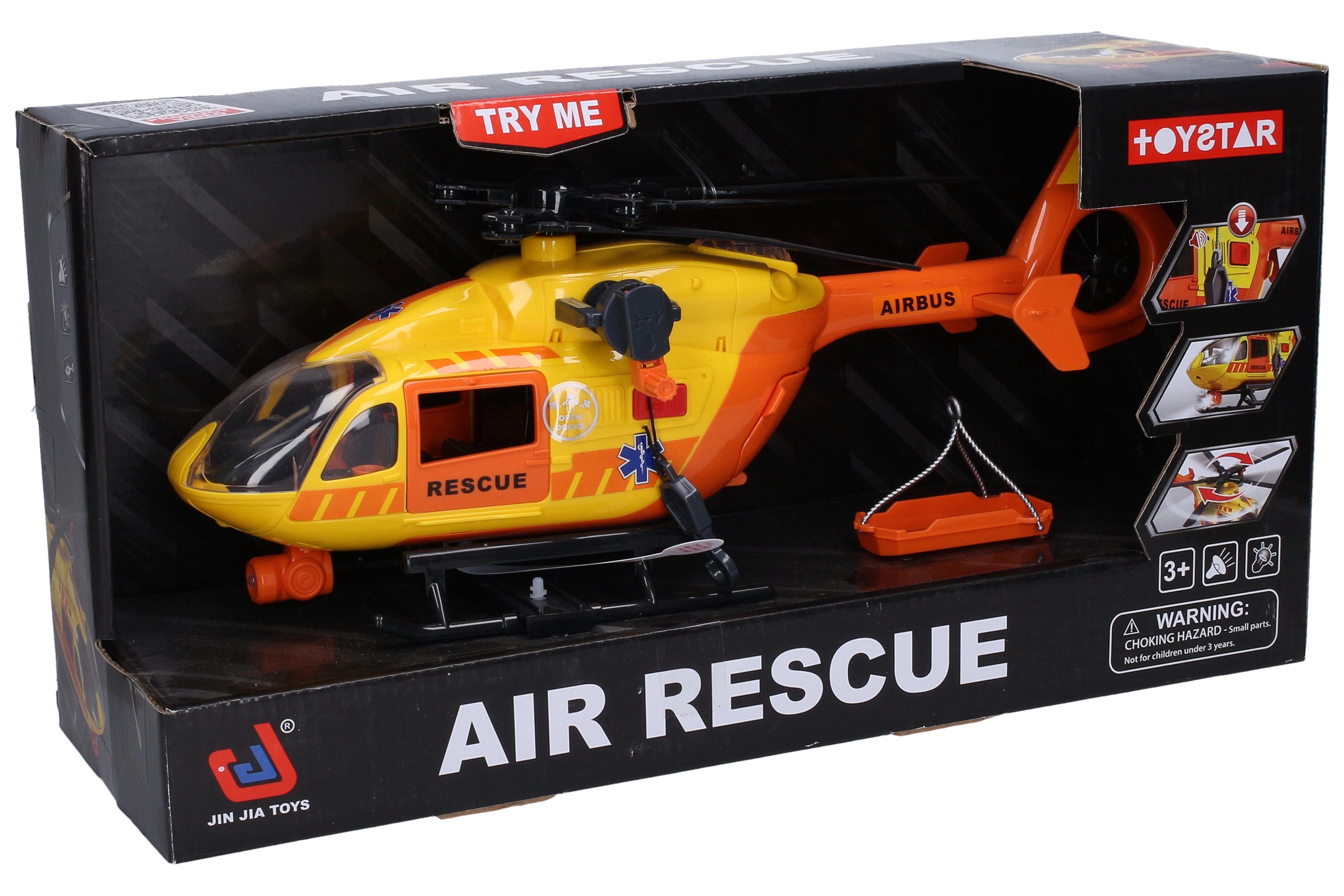 A nehezen megközelíthető helyekről történő látványos mentésekhez kihúzható kötél horoggal szolgál, amelyet egy forgatható karral lehet kezelni. A csomagban hordágy is található, amely a horogra akasztható. A játék azonnal indulhat – 2× AAA elem mellékelve, az elemtartó a helikopter alján található.