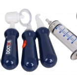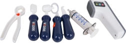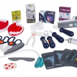 Sztetoszkóp, hőmérő, fecskendő, csipesz, olló, fogászati eszközök, „röntgen” kártyák, fogmodell, betegkártya és további kiegészítők.