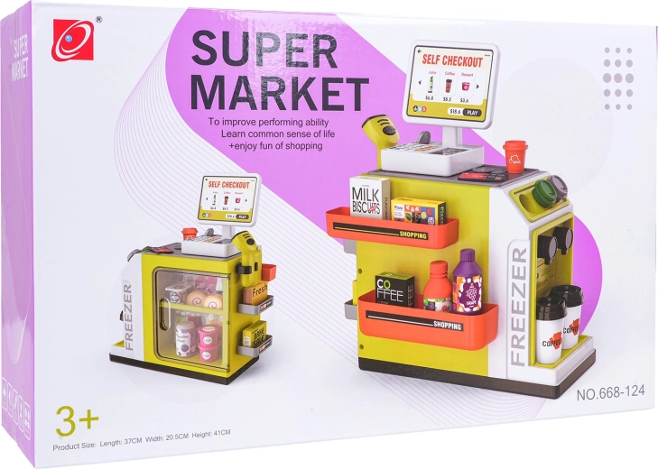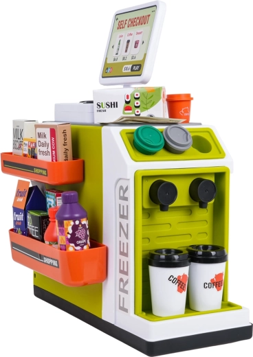 A gyerek mini szupermarket ideális választás a kreatív játékhoz és a szociális készségek fejlesztéséhez. Az önkiszolgáló pénztár hangjaival, a világítós szkennerrel és a kártyás fizetés szimulációjával a gyerekek valósághű vásárlási élményt kapnak. A színes polcok, a gazdag tartozékok és a nyitható hűtő/fagyasztó serkentik a fantáziát, és segítenek az alapvető számolás, válogatás és szerepjáték elsajátításában.