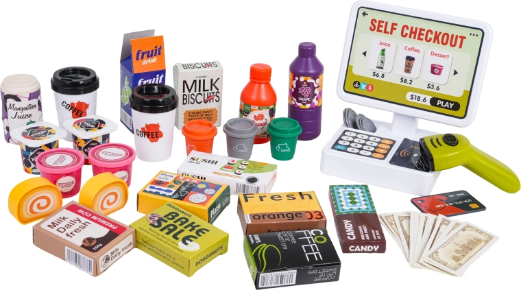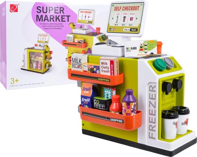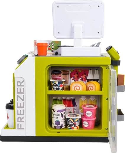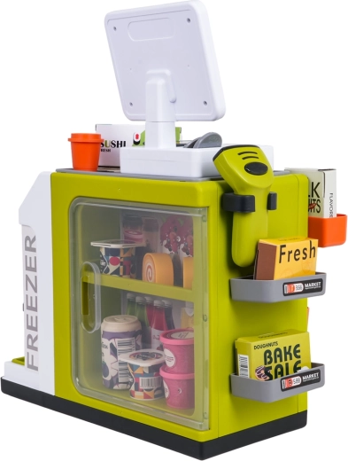 Változtasd a gyerekszobát kis bolttá! Ez a teljes mini szupermarket önkiszolgáló pénztárgépet kínál hangokkal, világítós szkennert, nyitható fagyasztót/hűtőt, sőt egy gyerek kávéfőzőt is poharakkal. A csomag része sok vonzó élelmiszer-kiegészítő, játék bankjegyek és érmék, valamint bankkártya a valósághű vásárlószerepjátékhoz.