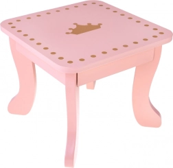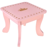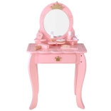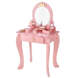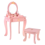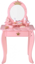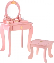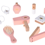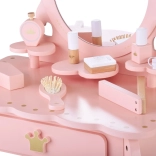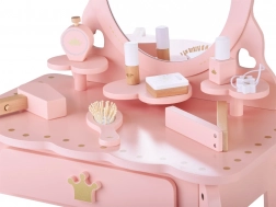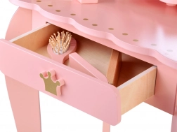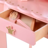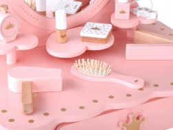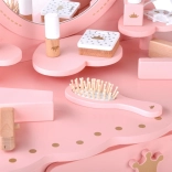 A készlethez kényelmes szék is tartozik, valamint számos fa és műanyag kiegészítő: kefe, hajszárító, hajvasaló, gumigyűrűk, rúzs, szemhéjpúder, parfüm, körömlakk és három szívecske alakú pohár az apróságok elhelyezésére. A rózsaszín, arany és ezüst részletek finom kombinációja szépen illik a gyerekszobába.