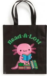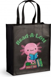 Stílusos és praktikus bevásárlótáska axolotl motívummal, aki egy könyvkupacon olvas. A táska könnyen tisztítható, újrahasznosított műanyagból készült, és remek alternatívát kínál az egyszer használatos műanyag táskák helyett megfizethető áron.
