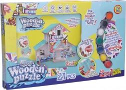 Ez a 3D fa házikó ideális választás mindenkinek, aki szeret alkotni és logikai kirakókat építeni. Először összeállítja a masszív fa szerkezetet, majd saját színeivel díszíti. Az eredmény egy egyedi dekoráció és remek ajándék.