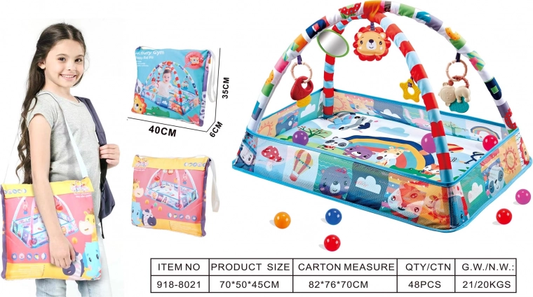 A levehető ív változatos játékokkal felszerelt: biztonsági tükör, gomba csörgővel és rágókával, méhecske rágókával és csörgővel, külön rágóka és oroszlánka sípolóval. A szőnyeg könnyen átalakítható járókává vagy száraz medencévé, és kiegészíthető a mellékelt labdákkal. A teljes szett színes válltáskában található a kényelmes hordozás érdekében.