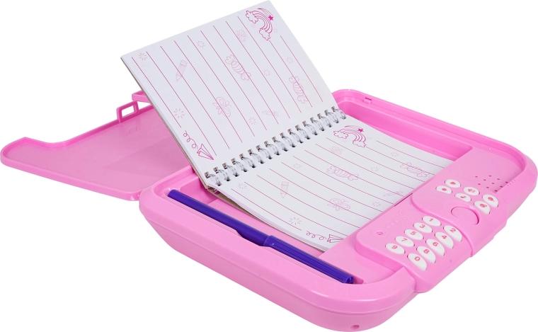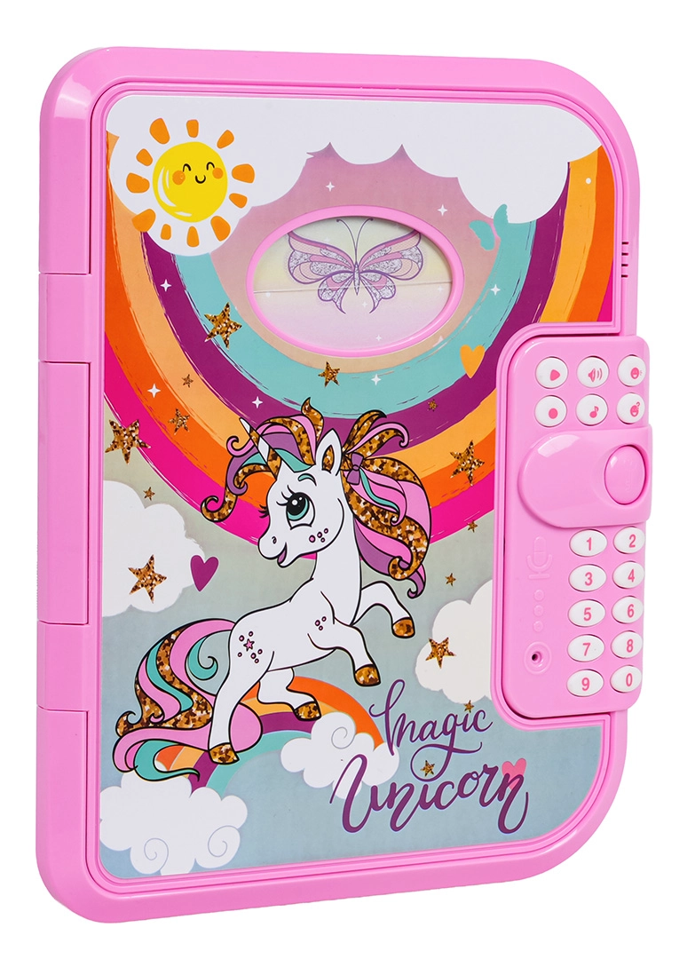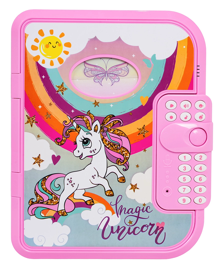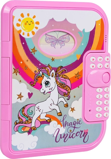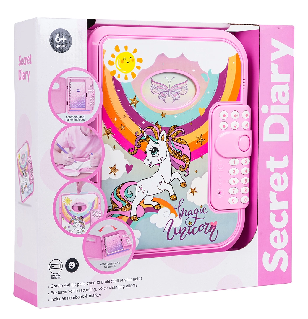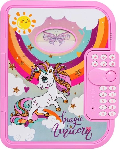 Ez az elektronikus titkos, unikornisos napló PIN-zárral óvja a gyerekek magánszféráját. A gyerekek akár 10 saját üzenetet rögzíthetnek, vidám dallamokat játszhatnak le, megváltoztathatják a hangszínt, és élvezhetik az interaktív „Találd ki a kódom” játékot. A fedélen átlátszó ablak van a tulajdonos fényképének, belül pedig praktikus notesz és filc.
