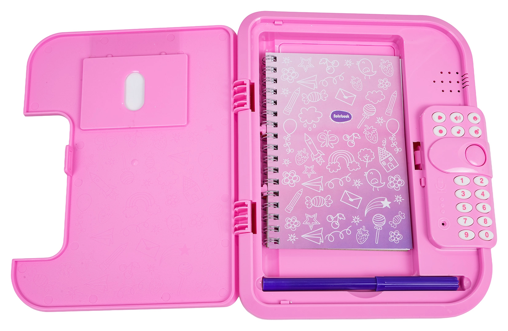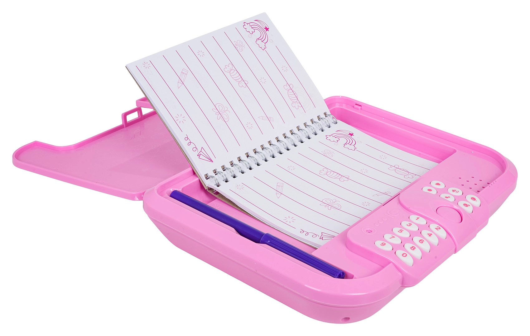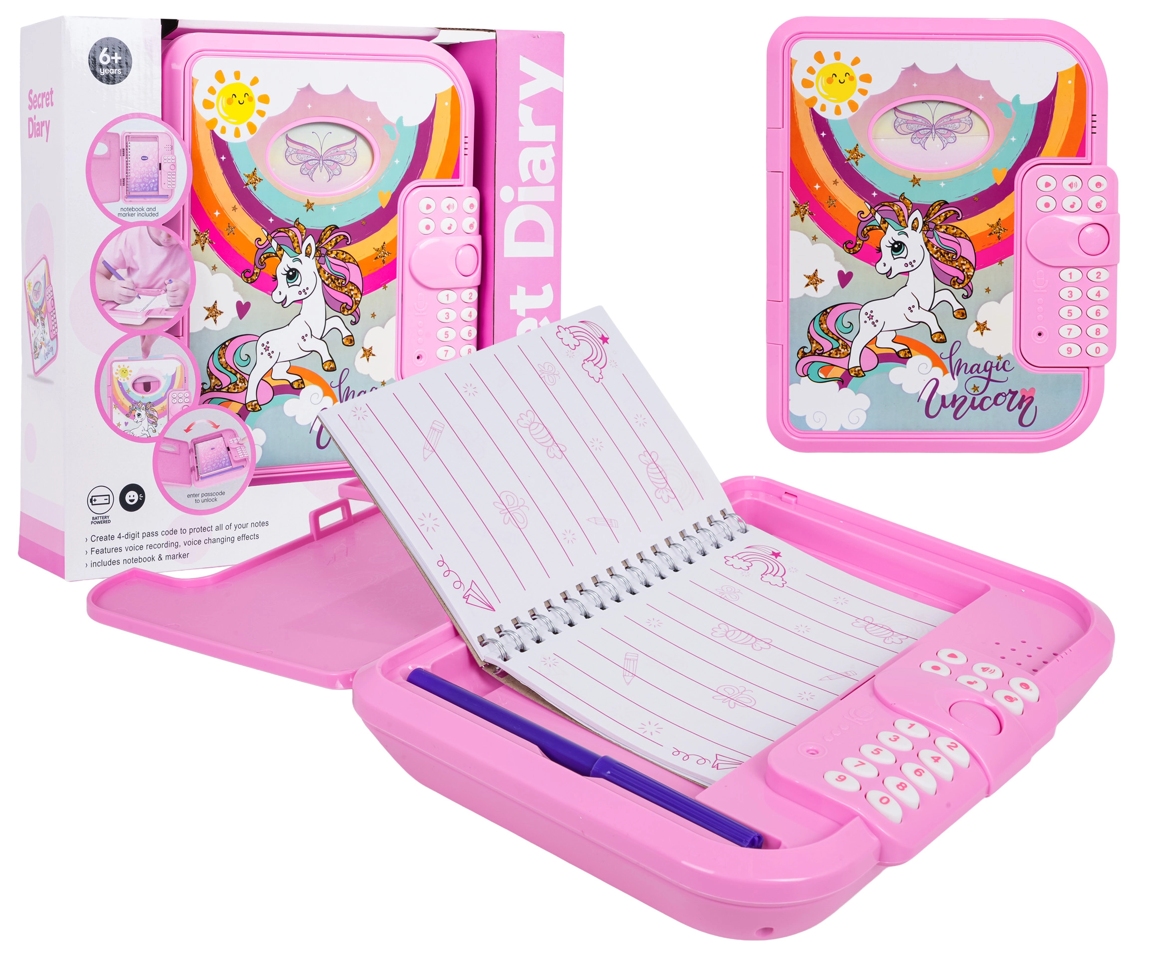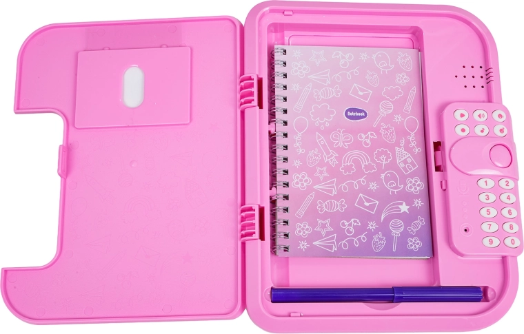 Ez az elektronikus titkos, unikornisos napló PIN-zárral óvja a gyerekek magánszféráját. A gyerekek akár 10 saját üzenetet rögzíthetnek, vidám dallamokat játszhatnak le, megváltoztathatják a hangszínt, és élvezhetik az interaktív „Találd ki a kódom” játékot. A fedélen átlátszó ablak van a tulajdonos fényképének, belül pedig praktikus notesz és filc.
