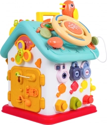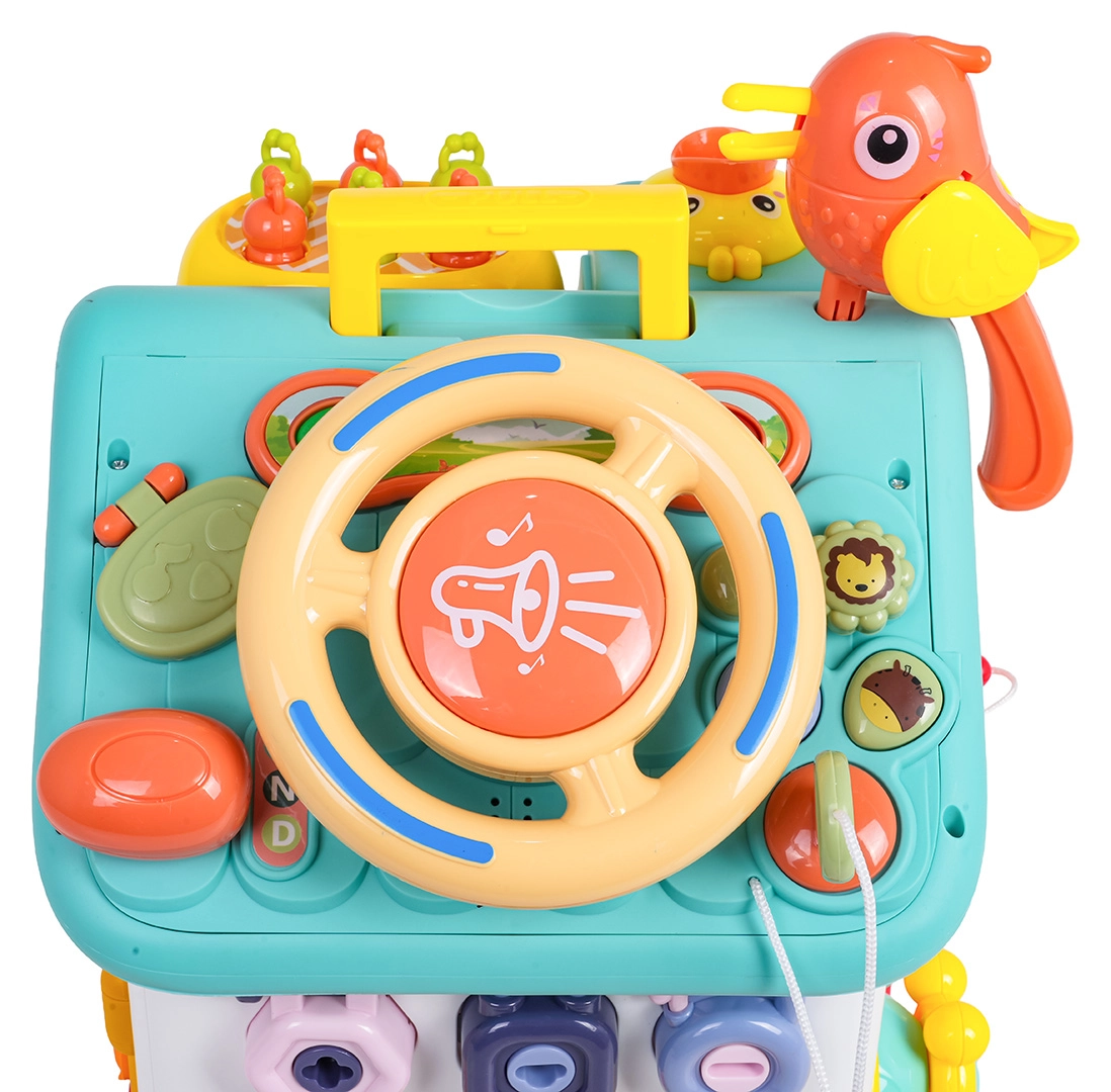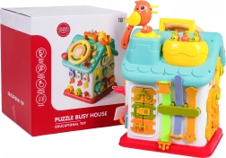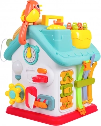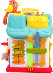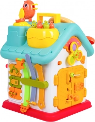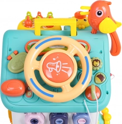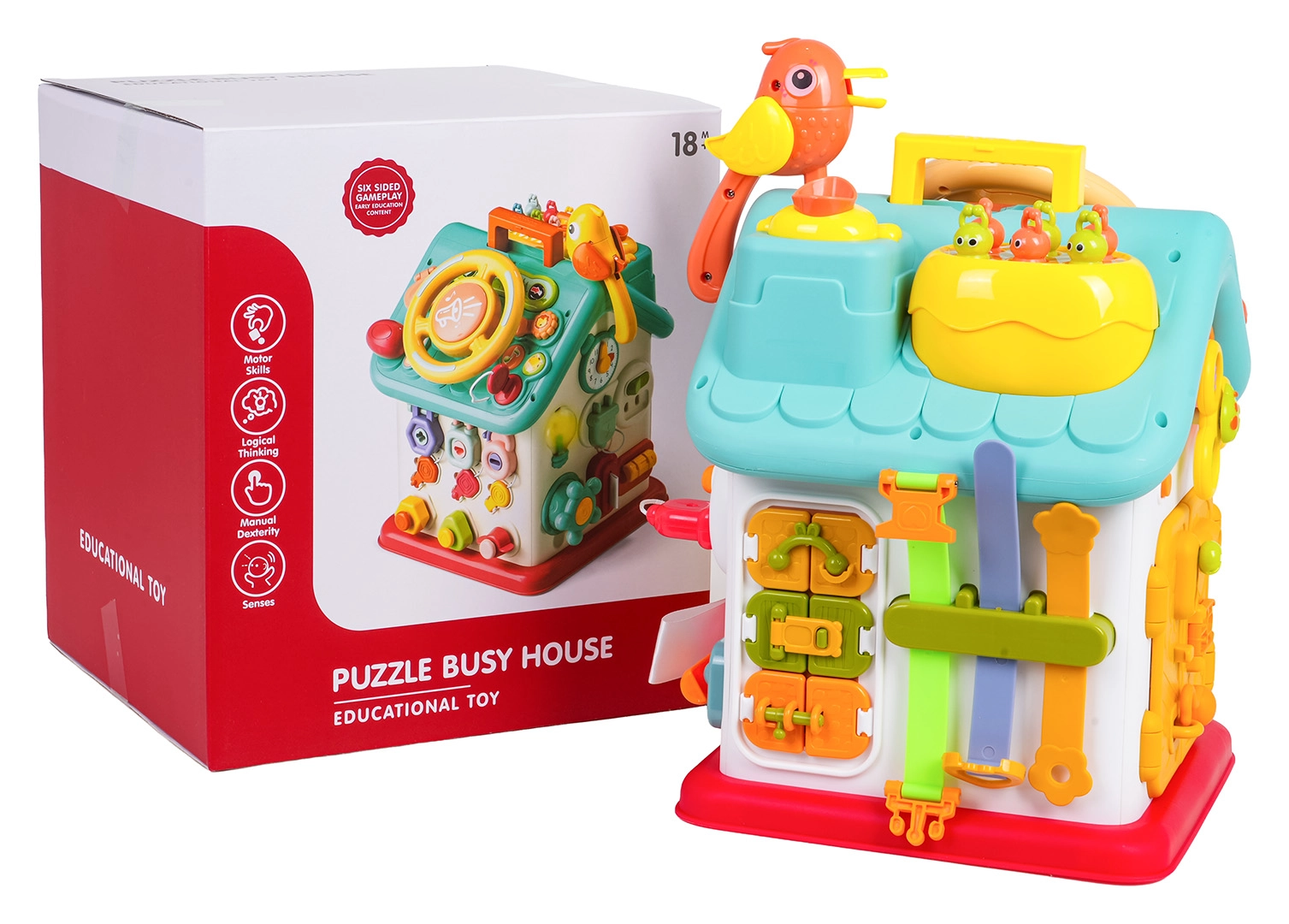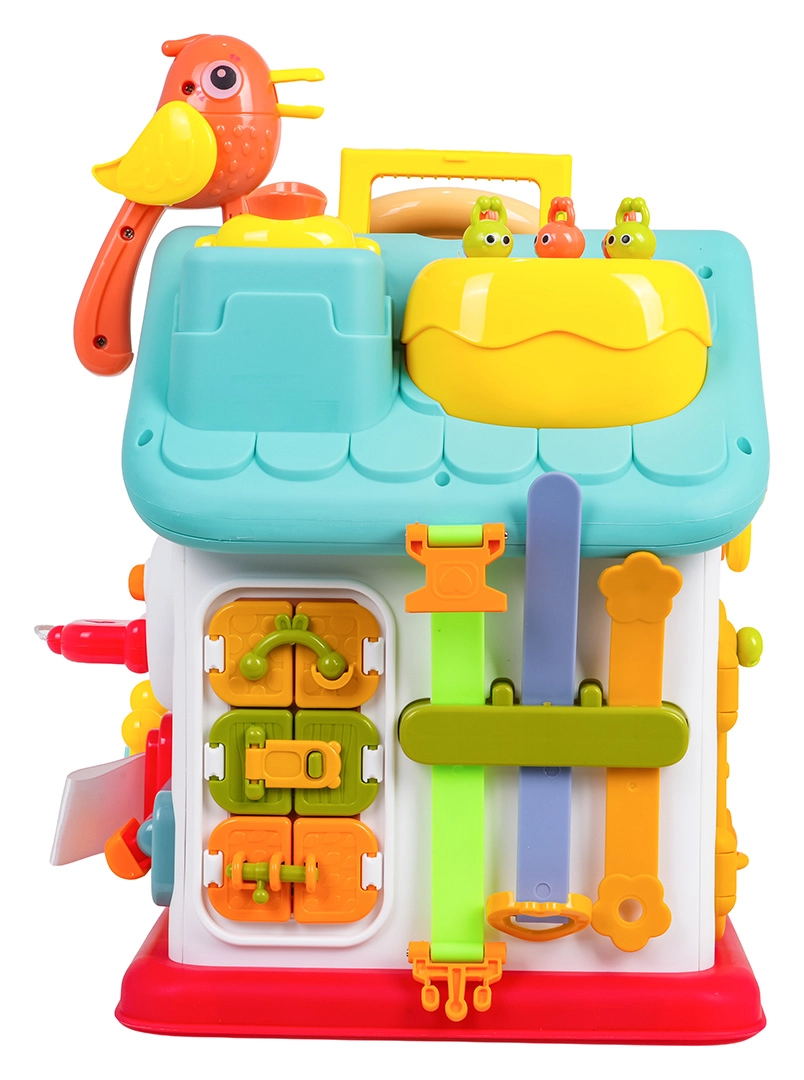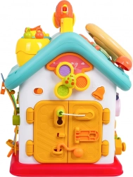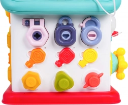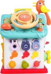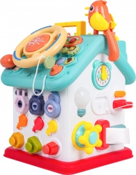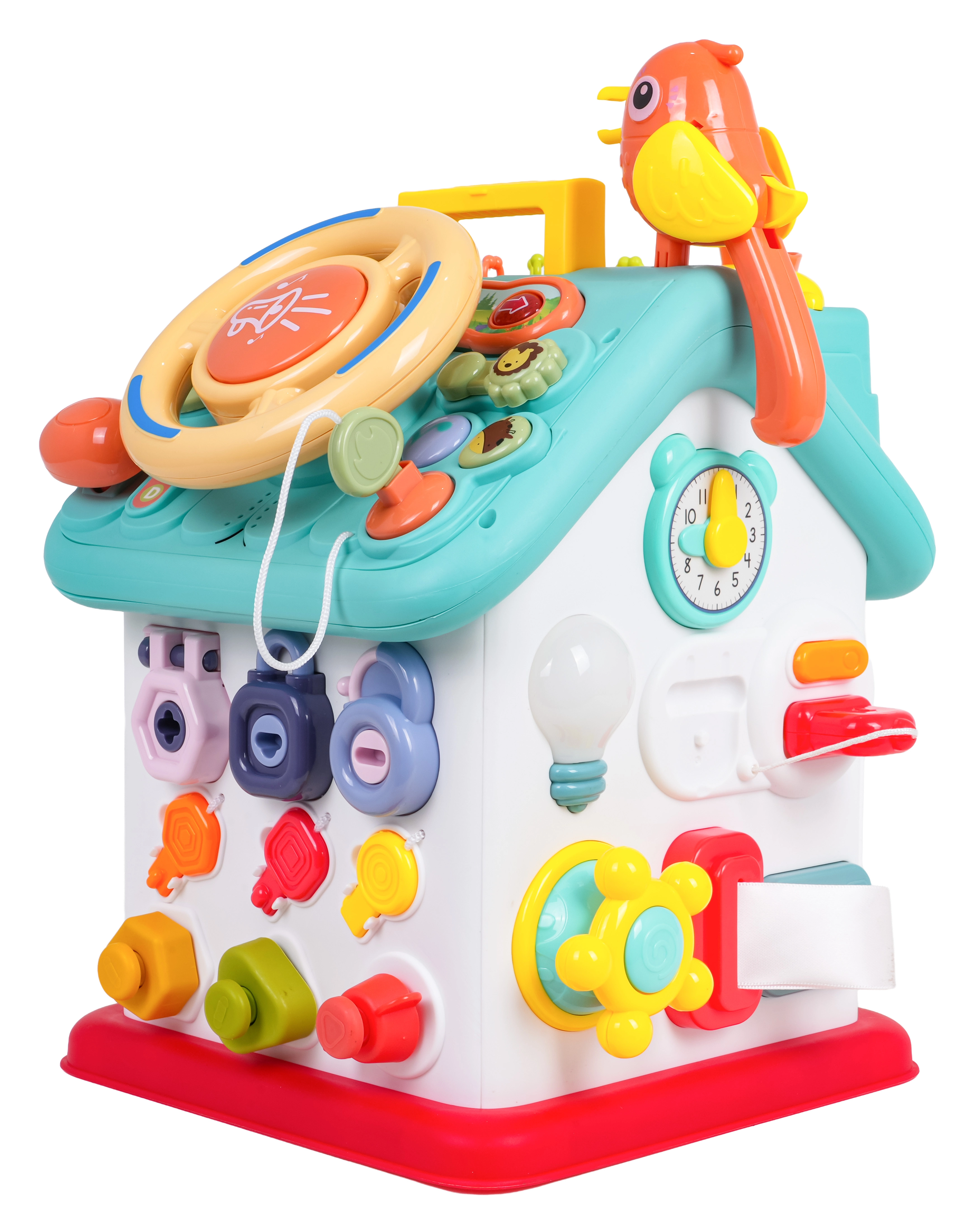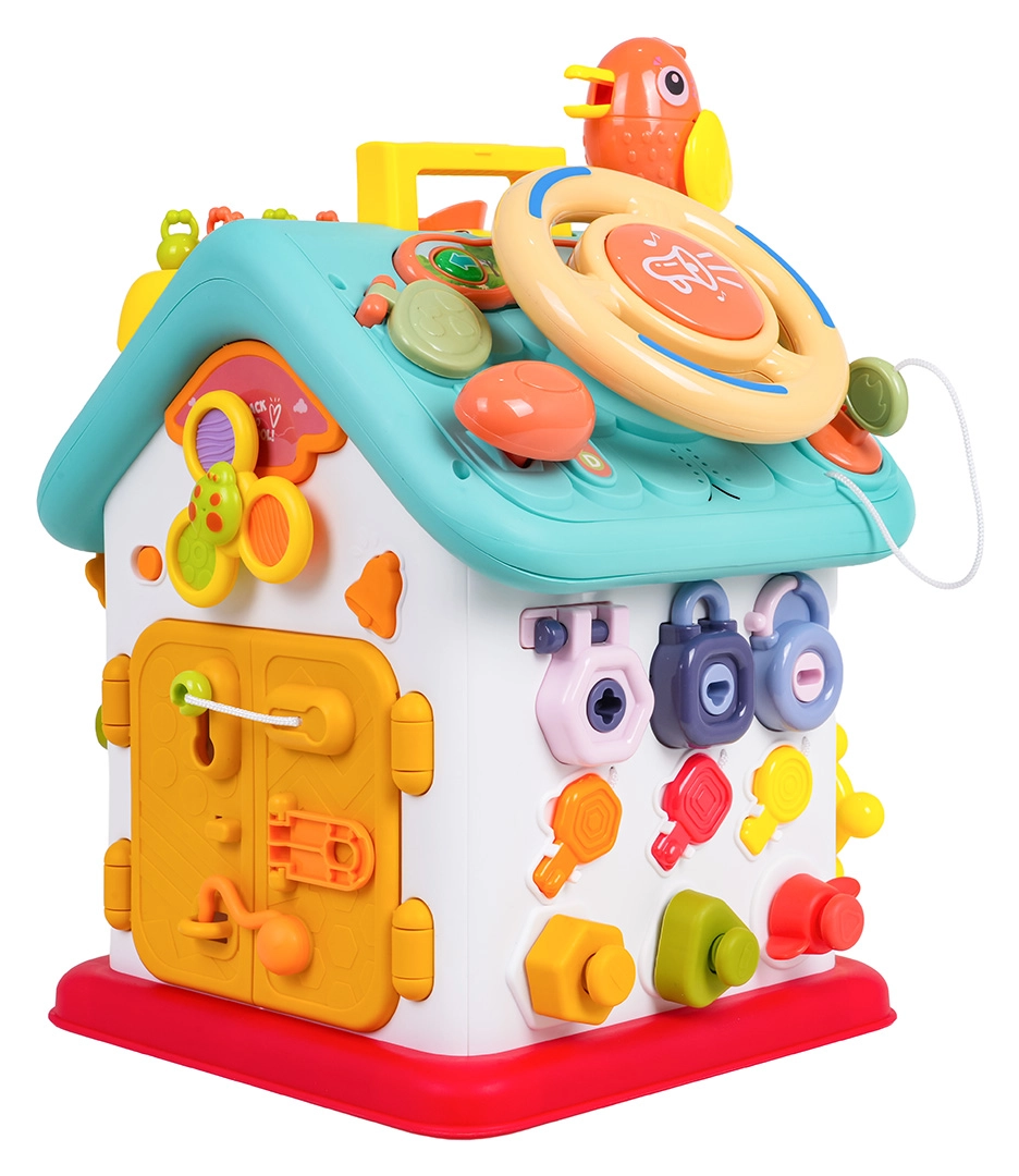 Ez a színes, interaktív házikó gazdag tevékenységeket kínál minden oldalon és a tetőn is: háttérvilágítású kormány dudával, irányjelzőkkel és kulcsos indítóval, zárak és kulcsok készlete a párosításhoz, mozgatható mutatós óra, kapcsolók, áttételek és további manipulációs elemek. A gyerekek gyakorolják a kéz–szem koordinációt, és megértik az ok–okozati működést.