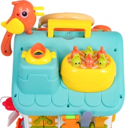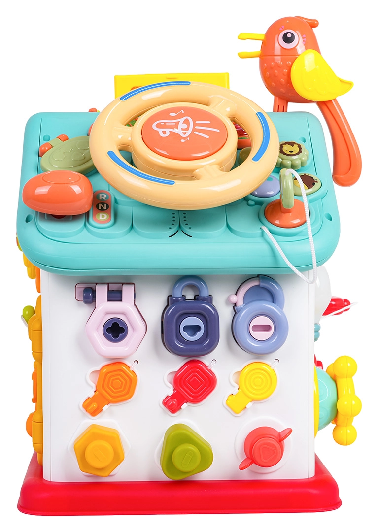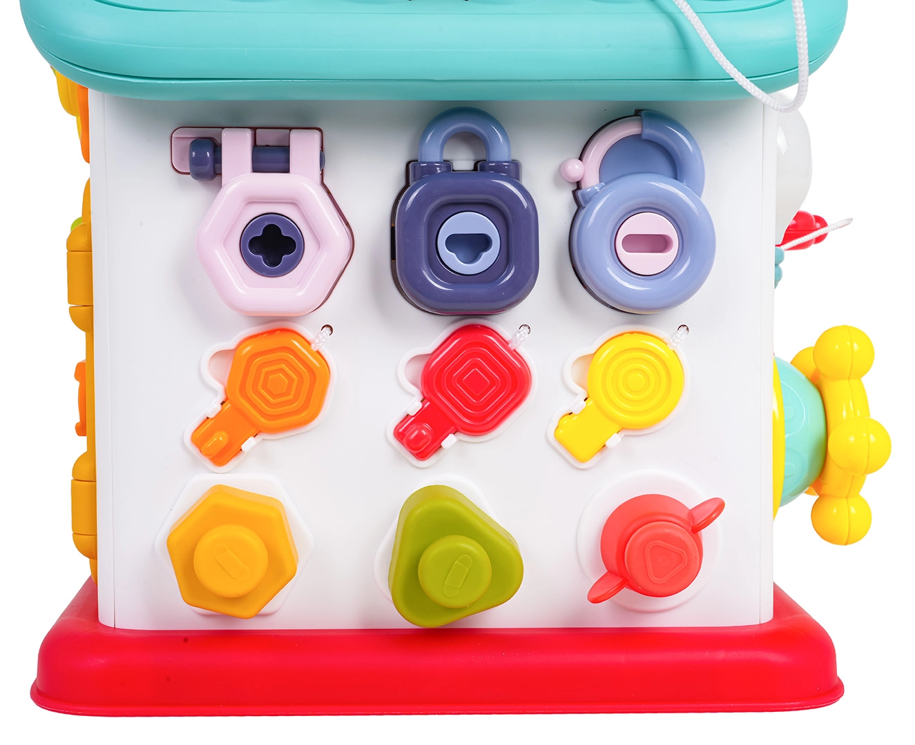 Három színes kulcs és három zár tanítja a gyerekeket a formák és színek párosítására. A zárak alatti forgó kerekek és kis fogantyúk tovább fejlesztik az ujjak ügyességét és a koordinációt.