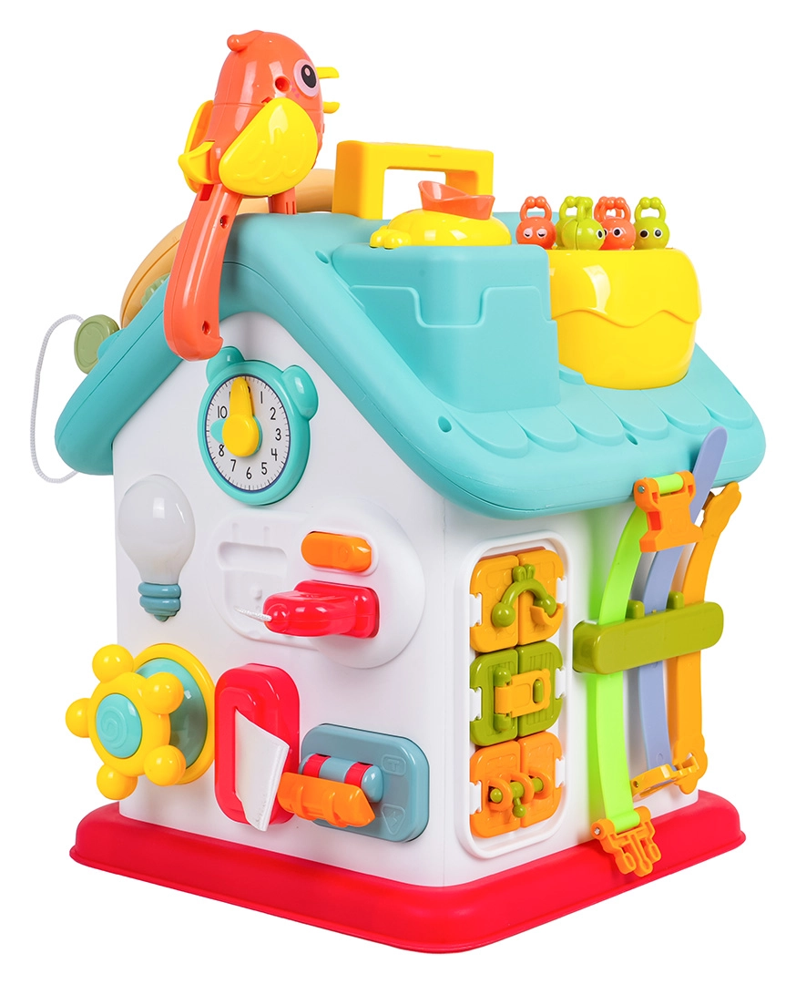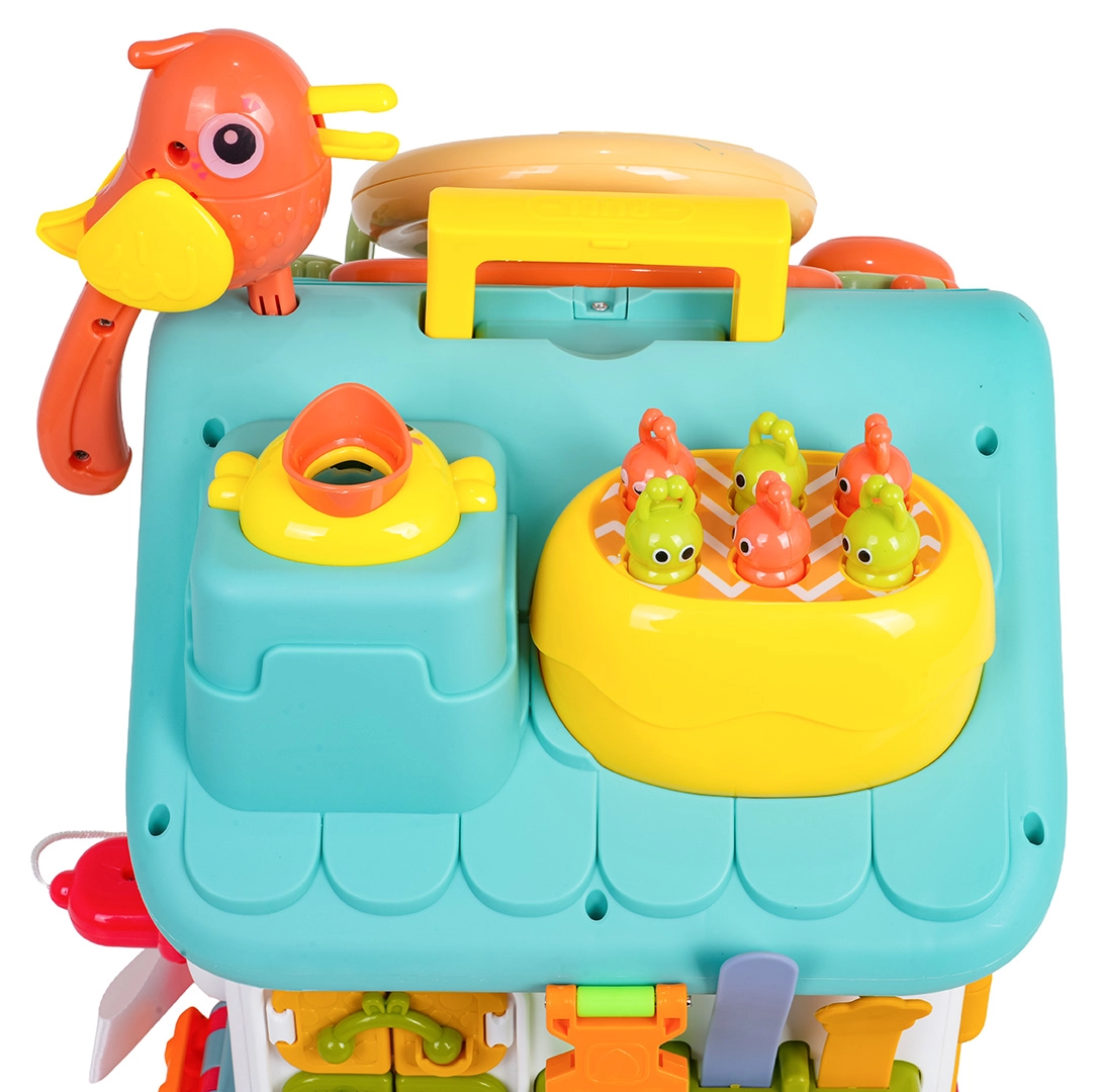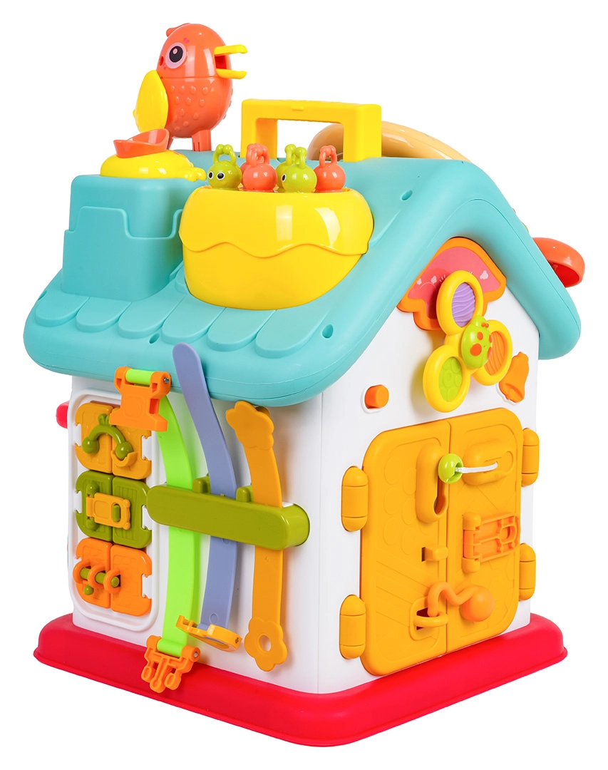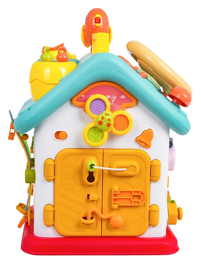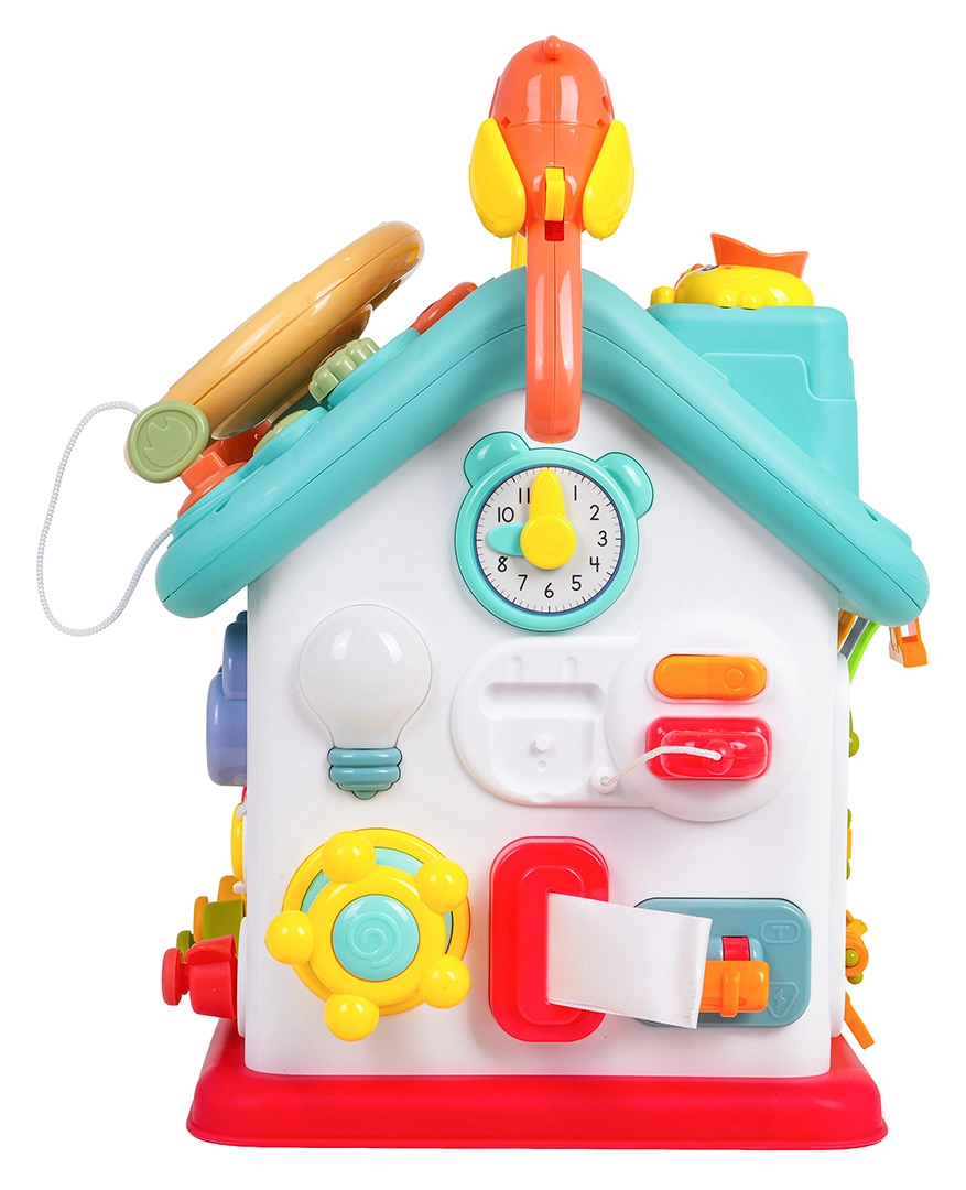 Beépített dallamok, járműhangok és csengő ösztönzik a hallási észlelést, míg a villogó jelzőfények és lámpácskák a vizuális figyelmet fejlesztik. A fogantyúnak köszönhetően a házikó könnyen hordozható, strapabíró, éles szélektől mentes kialakítása pedig ideális a mindennapi játékhoz.