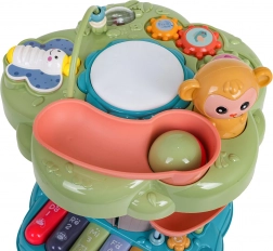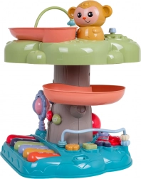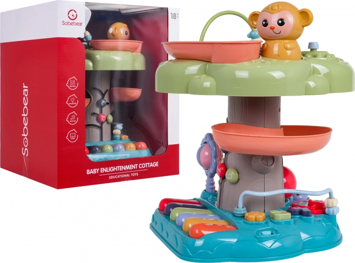 Az interaktív fa ideális fejlesztő játék a legkisebbeknek. Felkelti a gyerekek érdeklődését a világító zenedob a tetején, a zongora négy móddal (számok, dallamok, állatok és hangjaik, hangok), valamint a spirális pálya a golyóknak, amelyen a golyók örömmel gurulnak lefelé. A színes elemek, a fények és a dallamok támogatják az érzékszervi fejlődést és az ok-okozat megértését.