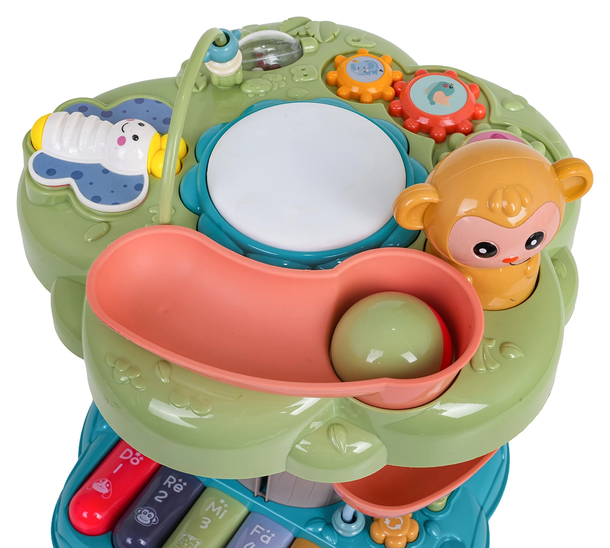 fény- és hangeffektek, zongora 4 móddal, dob, dallamok, számok és állatok megnevezése, fogaskerekek, gyöngyök, csörgő, formapárosítás, spirális csúszda golyóknak