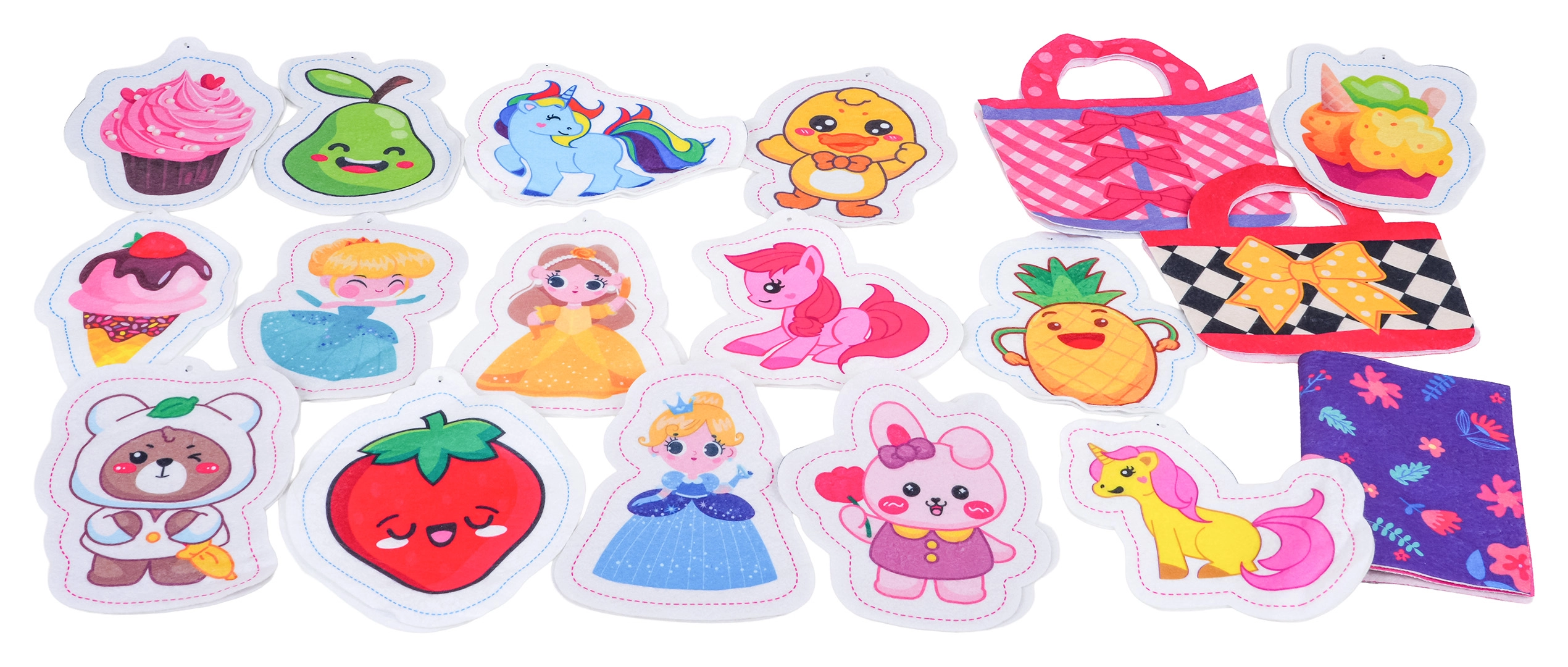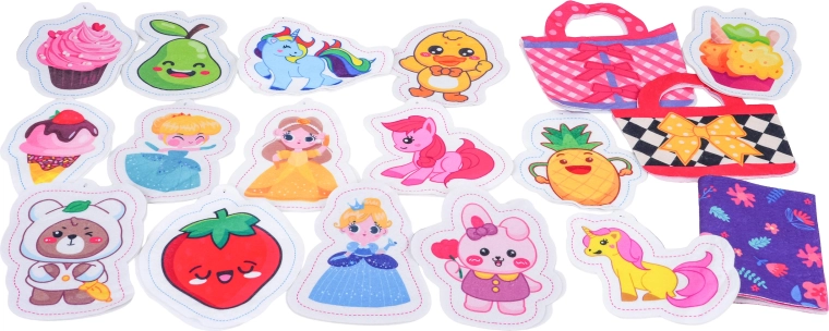 A készlet tartalmaz filc táskákhoz való előre vágott darabokat, textil elemeket, plüss díszek készítéséhez sablonokat, töltőanyagot, golyós láncokat és ollót – mindent, amire a gyerekeknek szükségük van saját kiegészítők és aranyos függődíszek elkészítéséhez. A játék fejleszti a koordinációt, a türelmet és a kreativitást.