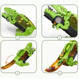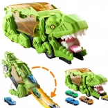 Nyisd fel a dínó fejét, és engedd le a narancssárga csúszdát. A kisautók simán kigördülnek, és kezdődhet a verseny.