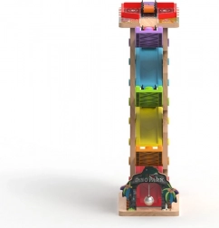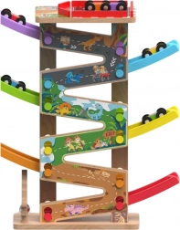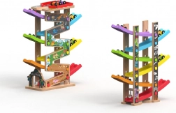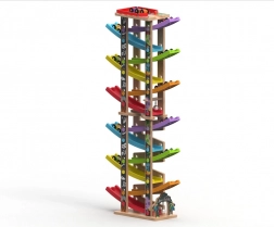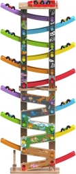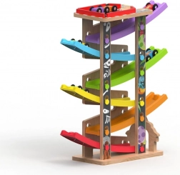 Ez a függőleges fa versenytorony 6 színes rámpával a gravitáción alapuló, dinamikus játékot hozza el. A gyerekek a kisautót felülre helyezik, és figyelik, ahogy lefelé suhan a különböző szinteken, kanyarokon és hidakon át. A stabil felépítésnek és a kompakt méreteknek köszönhetően a pálya jól illik a gyerekszobába vagy játszósarokba, és intenzív használat mellett is megállja a helyét.