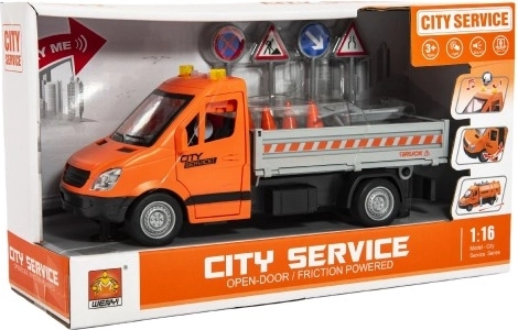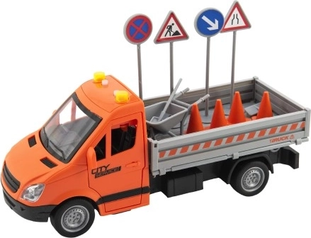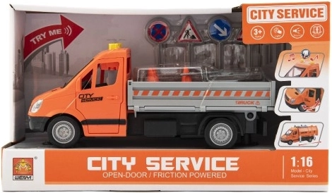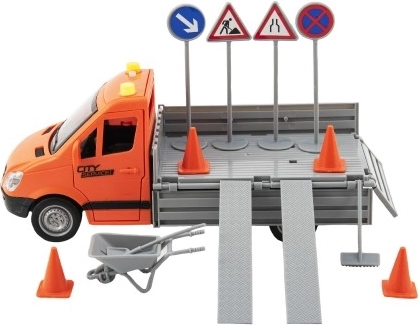 Tarts rendet a városban a részletgazdag útkarbantartó teherautóval. A lendkeréknek köszönhetően a jármű meglökés után elindul, a fény- és hangeffektek fokozzák a valódi útmunkák hangulatát, a mellékelt táblák, kúpok és eszközök pedig bővítik a játéklehetőségeket.