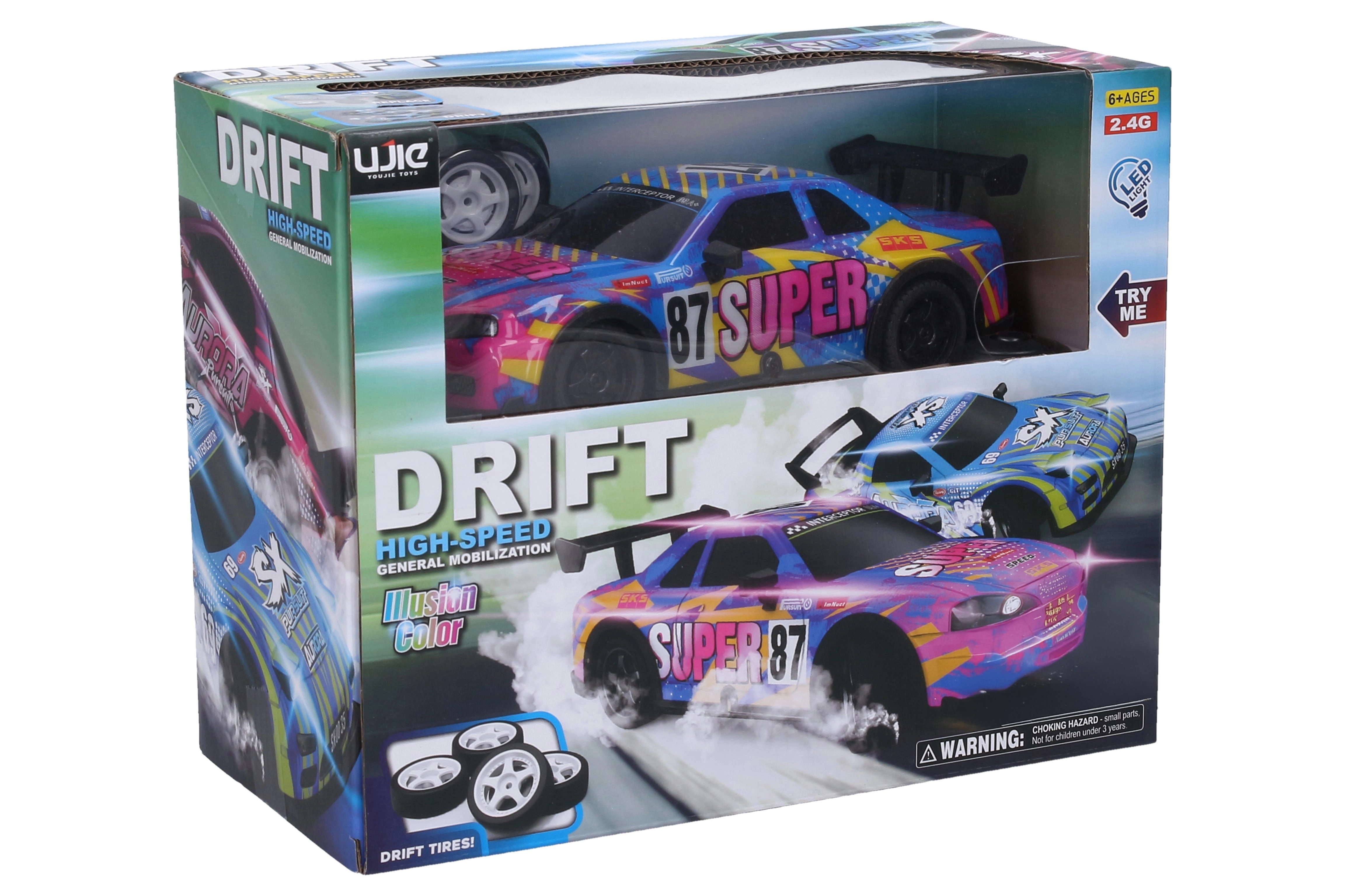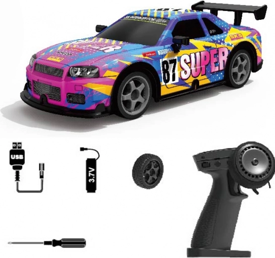 Élvezd az adrenalindús vezetést ezzel a szuper szórakoztató, driftelésre képes RC autóval! A modell fényhatásokat, 2,4 GHz-es frekvenciát a stabil irányításhoz, akár 12 km/h sebességet és akár 40 m hatótávot kínál. A csomagban 4 standard és 4 drift kerék is található a különböző vezetési stílusokhoz, valamint egy kényelmes pisztolymarkolatos távirányító az egyszerű irányításhoz.