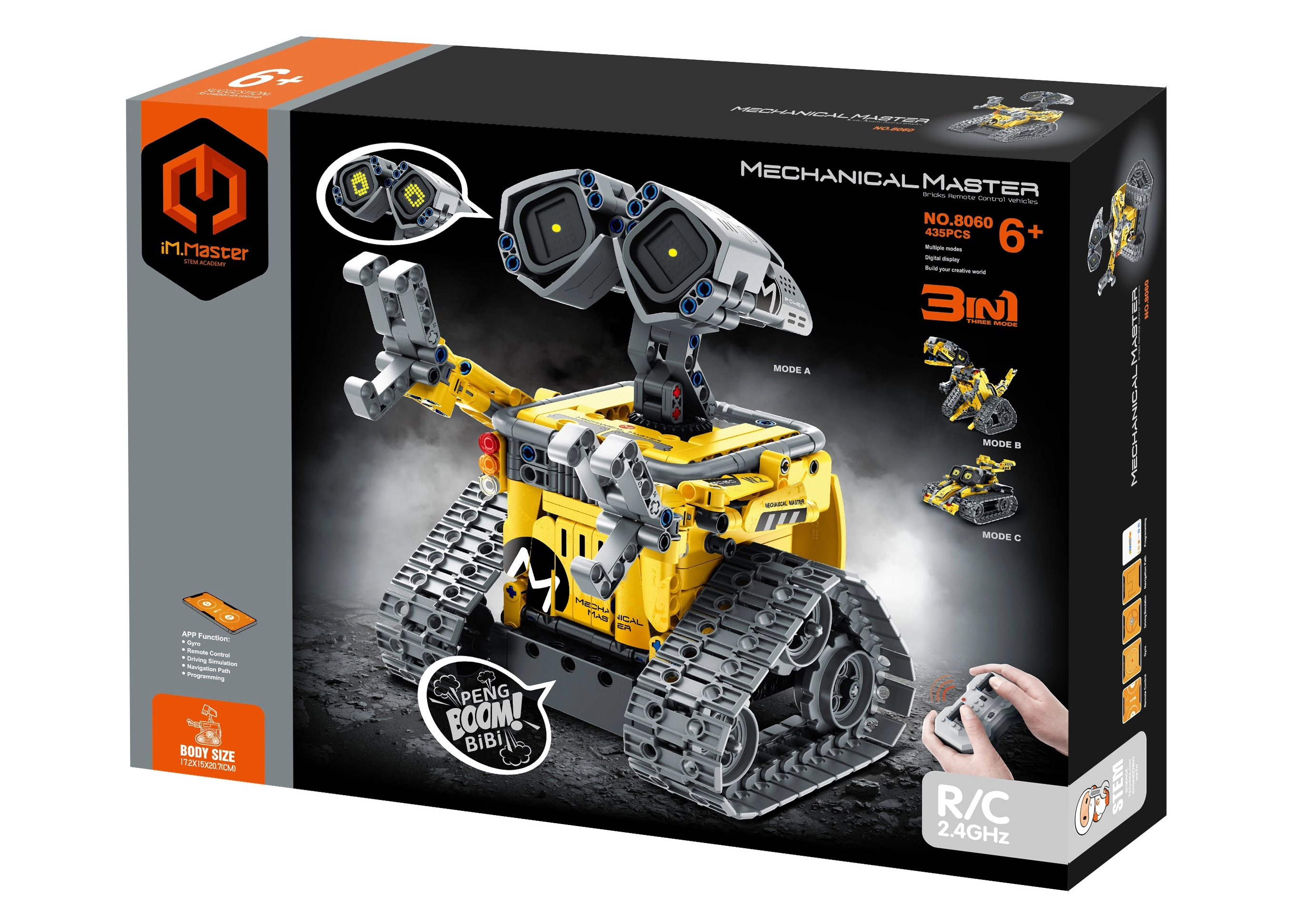 Fedezd fel az építés és irányítás élményét a sokoldalú iM.Master készlettel. A 435 elemből egyszerre három különböző modellt építhetsz, és a stabil 2,4 GHz-es frekvenciának és a Bluetoothnak köszönhetően a robotot távirányítóval vagy okostelefonnal is vezérelheted. A fény- és hangeffektek életre keltik alkotásaidat.