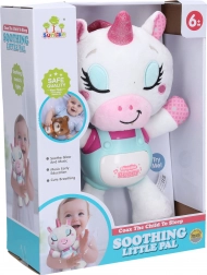 Aranyos, elalvást segítő unikornis, amely a altatók, a nyugtató zene, a horkolás hangjai és a finom fényhatás kombinációjával segít a gyermekeknek nyugodtan elaludni. A kezelés egyszerű – elég megnyomni a pocakját és kiválasztani az üzemmódot. A praktikus be/ki kapcsoló a játék oldalán található. Méret: 29 cm, tápellátás 3× AAA elem (nem tartozék).