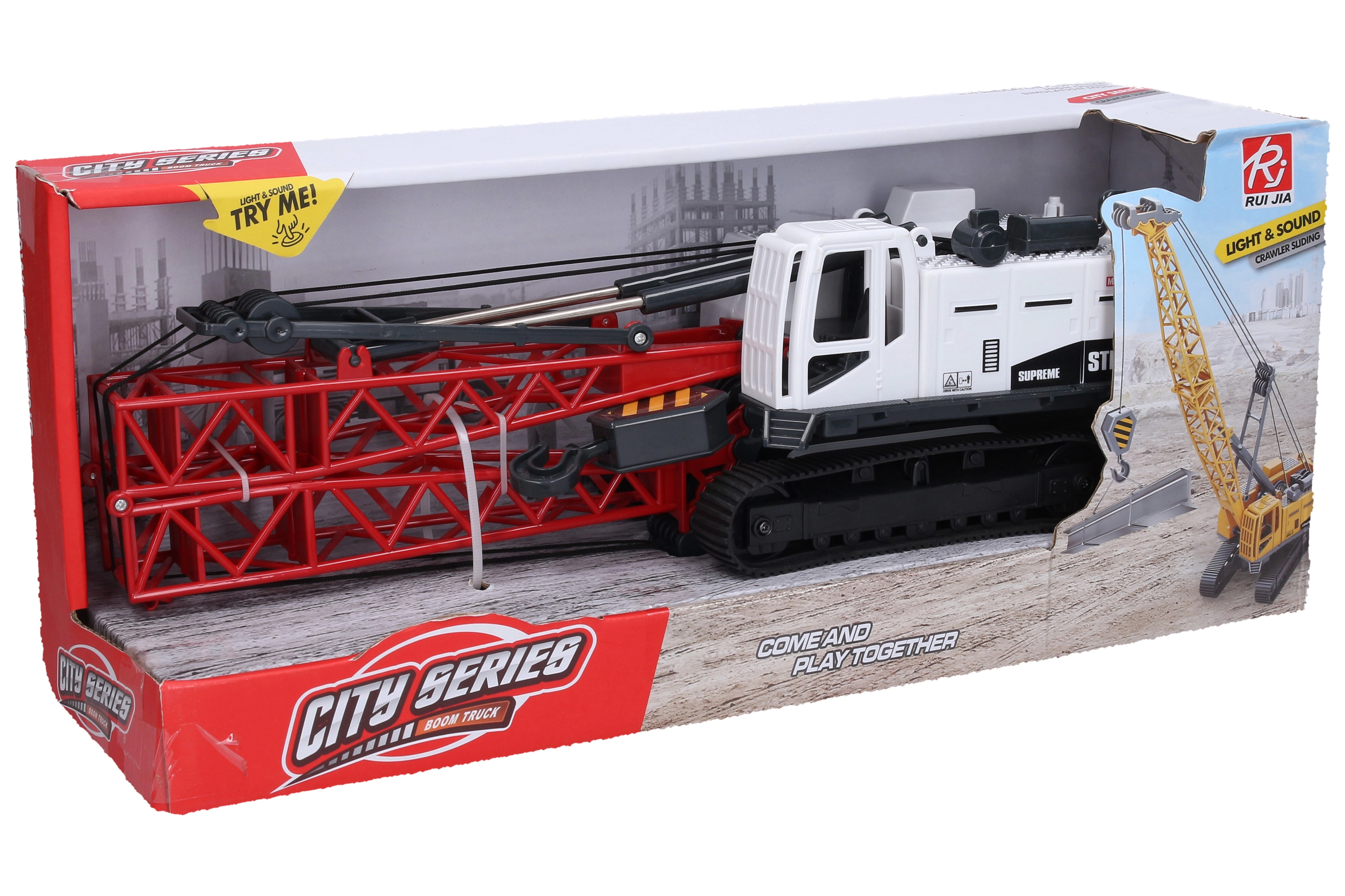 A valósághű lánctalpas daru a kis építőket fény- és hangeffektekkel nyűgözi le, amelyek a tetőn lévő gombokkal könnyen aktiválhatók. Kompakt, 42 cm-es méretének köszönhetően ideális beltéri és kültéri játékhoz egyaránt. 3× AG13 elem a csomagban, így a daru a kicsomagolás után azonnal bevethető.