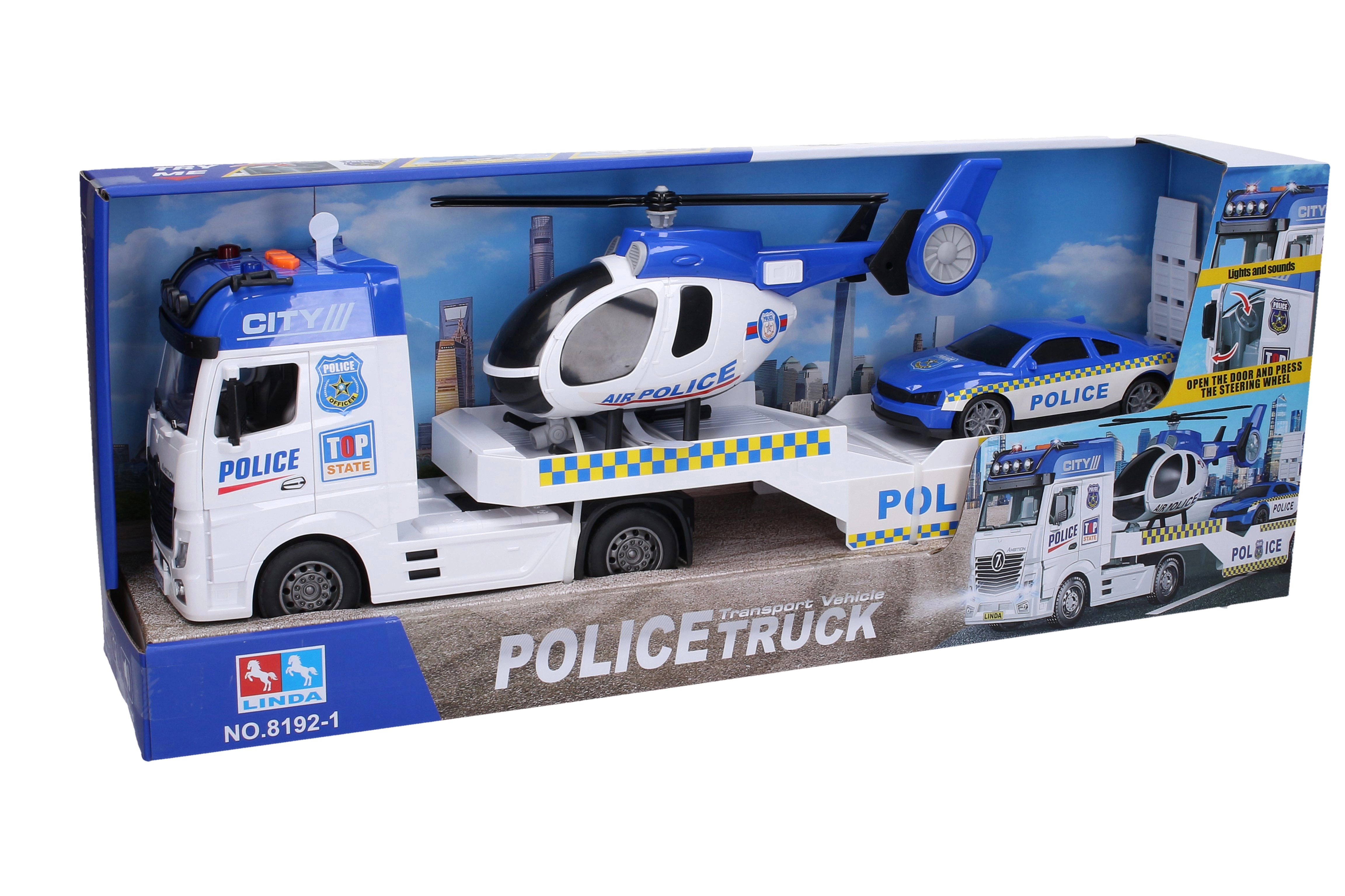 Akciószett kis mentőknek: 55 cm-es rendőrségi vontató 27 cm-es helikopterrel és 16 cm-es rendőrautóval, amely rengeteg szórakozást nyújt a fény- és hangeffekteknek köszönhetően. A vontató lendkerekes, az effektek gombokkal aktiválhatók. Az elemek a csomag részei, így a gyerekek azonnal játszhatnak a kibontás után.
