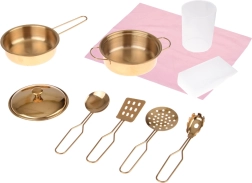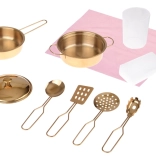 A csomag részét képezi az edény- és kiegészítő készlet, így a játék azonnal kezdődhet: fém fazék és lábas fedővel, merőkanál, szűrőkanál, lapát, tésztás fogó, műanyag pohár, szivacs és rózsaszín törlőkendő. Az alsó szekrények és polcok bőséges helyet kínálnak az élelmiszerek és kiegészítők tárolására.