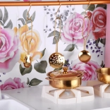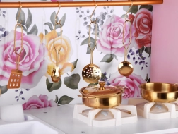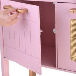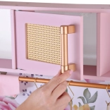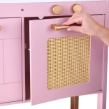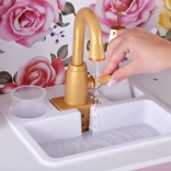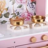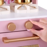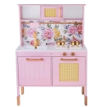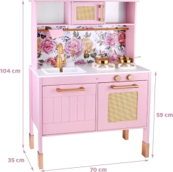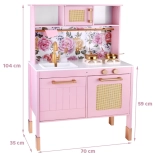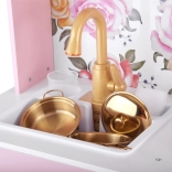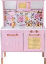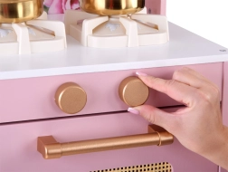Ez a retro, finom rózsaszín fa konyha tartós anyagokat ötvöz gyönyörű részletekkel: arany fogantyúk, virágos háttér és stabil lábak. A gyerekek élvezhetik a felnőttek utánzását a világító égőkkel, amelyek főzés és sütés effektust adnak, a kattanó hanggal ellátott forgatható gombokkal és a mosogatóval arany csappal.