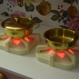Két égő pirosan felizzik, a forgatható gombokkal pedig főzés és sütés hatását keltik – tökéletes élmény a főzős szerepjátékhoz.