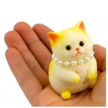 A fehér–sárga cica gyöngynyaklánccal és csillogó szemekkel játéknak és stílusos dekorációnak egyaránt örömet szerez.