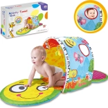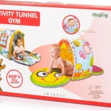 Színes minták, függő játékok és biztonságos alagút támogatják az érzékelést, a kéz–szem koordinációt és a nagymozgások fejlődését már az első hónapoktól.