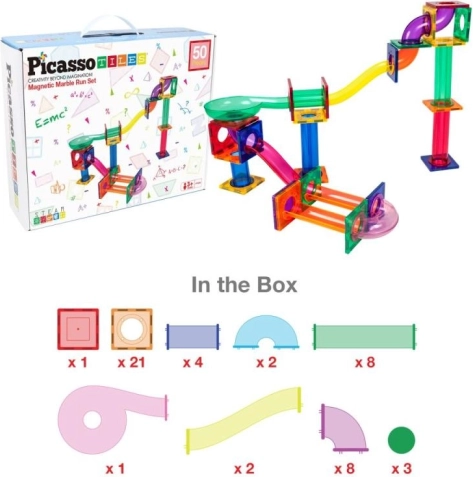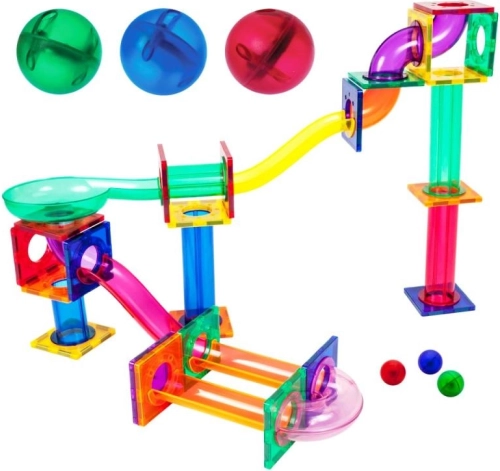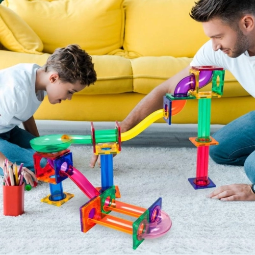 Ez a színes, átlátszó építőkészlet mágneses panelekkel és csövekkel végtelenül variálható golyópályák építését teszi lehetővé – az egyszerű útvonalaktól a bonyolult, többszintes konstrukciókig. A stabil kapcsolatoknak és a sima pályaelemeknek köszönhetően a golyók egyenletesen haladnak át a kanyarokon, a akadályokon és a tölcséreken.