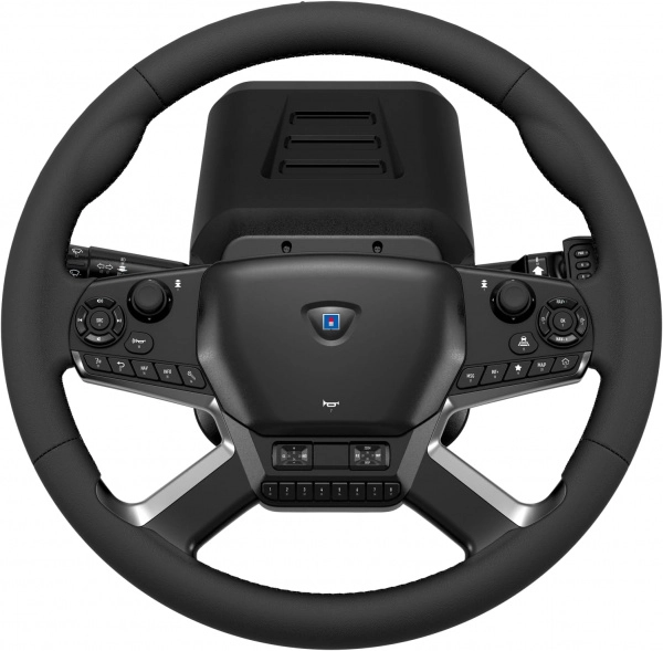 A 40 cm átmérőjű, műbőr borítású kormány 1800°-os elfordulási tartománnyal hiteles érzetet ad a nehéz tehergépkocsik irányításához, akár úton, akár a depóban.