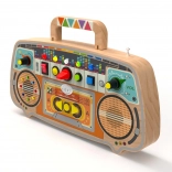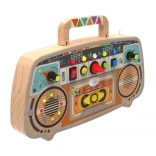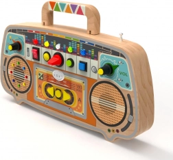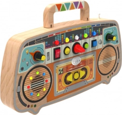 Ez az egyedi, retro rádió stílusú fa activity board a valódi FM adások hallgatását ötvözi az interaktív játékkal. A gyerekek tekerhetnek, kapcsolhatnak, csúsztathatnak, és figyelhetik a LED panel színes fényeit. Így ösztönző élményben lesz részük, amely fejleszti a kéz–szem koordinációt, a zenei hallást, valamint a színek és formák érzékelését.