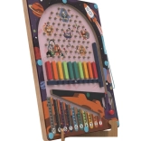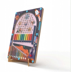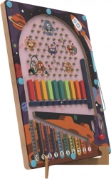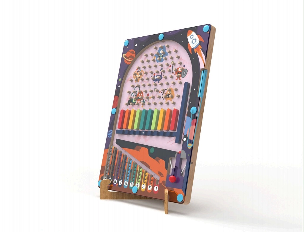 Ez az egyedi, űr témájú fa játék a flipper pörgős szórakozását ötvözi az okos, mágneses golyókkal történő pontszerzéssel. A kilövővel a gyerekek megpróbálják eltalálni a kijelölt mezőket, követik a pontszámot, és fejlesztik becslésüket és pontosságukat. Az áttekinthető pályakialakítás megkönnyíti az eredmények kiértékelését és motivál a további próbákra.