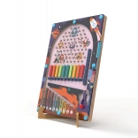 A színes játéktábla pálcikákkal, pályákkal és pontmezőkkel minden próbálkozásnál fejleszti a finommotorikát, a kéz–szem koordinációt és a türelmet.