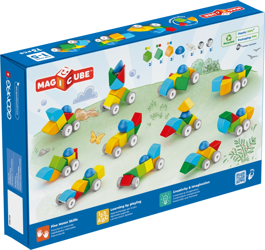 A Geomag Magicube autó okos mágneses építőkészlet a legkisebbeknek. A biztonságos mágneseknek köszönhetően az elemek könnyen és stabilan kapcsolódnak egymáshoz, így a gyerekek gyorsan összerakhatnak különféle járműveket és egyszerű építményeket. A kerekek és alvázak mozgást és még több játékélményt adnak az alkotásoknak.