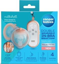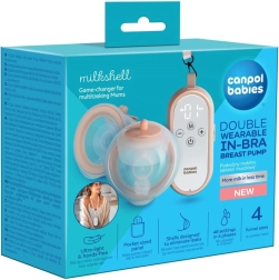 A Canpol babies MilkShell modern, dupla, vezeték nélküli, melltartóba illeszthető mellszívó, amely kényelmes, diszkrét és hatékony fejést biztosít. A pehelykönnyű gyűjtőtartályok (egyenként 180 ml) puha tölcsérrel tökéletesen illeszkednek a melltartóba, így szabad kézzel fejhetsz otthon és útközben is. Az áttekinthető gombokkal ellátott vezérlőegység a nyakpántnak köszönhetően nyakban hordható – minden kéznél van és azonnal használatra kész.