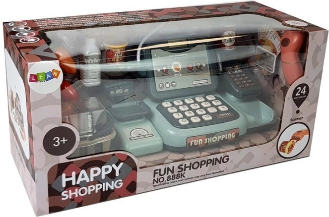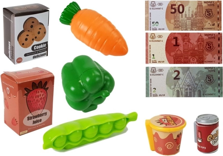 A csomag mindent tartalmaz: pénztárgép mérleggel és kártyaolvasóval, kézi vonalkódolvasó, kosár, játék élelmiszerek (keksz, dzsúsz, víz, fagylalt, kóla, zöldségek), fizetőkártya, bankjegyek és 6 darab műanyag érme. A játék maximálisan valósághű, és fejleszti a gyerekek fantáziáját és finommotorikáját.