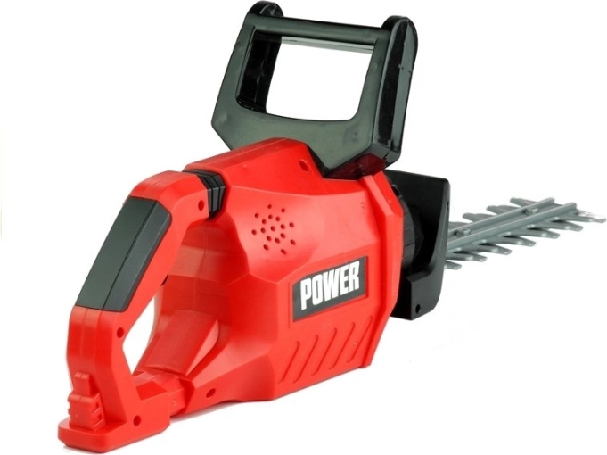 A POWER gyermek sövénynyíró úgy néz ki, mint egy valódi kerti szerszám, mégis teljesen biztonságos a gyerekeknek. A vörös test fekete és szürke–ezüst elemekkel, valamint a POWER felirattal élethű benyomást kelt, míg a kényelmes, formázott markolat jól kézre áll.