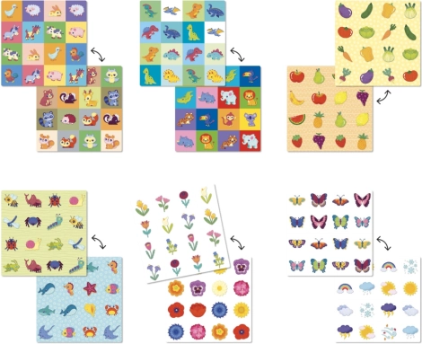 Hat kétoldalas kártya 192 képpel (állatok, gyümölcsök, virágok, tenger és más témák) fenntartja a gyerekek figyelmét, és számtalan játéklehetőséget kínál.