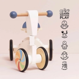 Ez a stílusos járgány kézzel utófestett, környezetbarát, vízbázisú festékekkel, és megfelel a legszigorúbb biztonsági szabványoknak. A puha gumiból készült szivárványos kerekek csendes, padlóbarát gurulást biztosítanak. A futóbicikli támogatja az aktív mozgást, a kognitív képességeket és a képzeletbeli játékot.