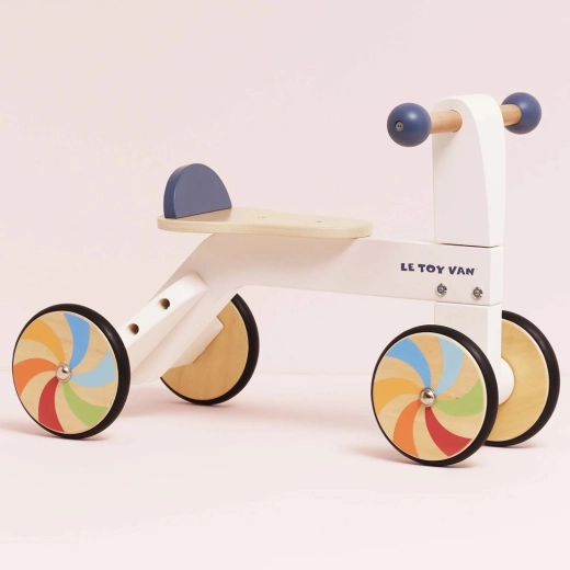 LE TOY VAN fa futóbicikli szivárványos kerekekkel, FSC® fából. Biztonságos festékek, kényelmes ülés és könnyű irányítás. Ideális 1,5+ éves gyerekeknek.