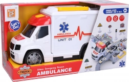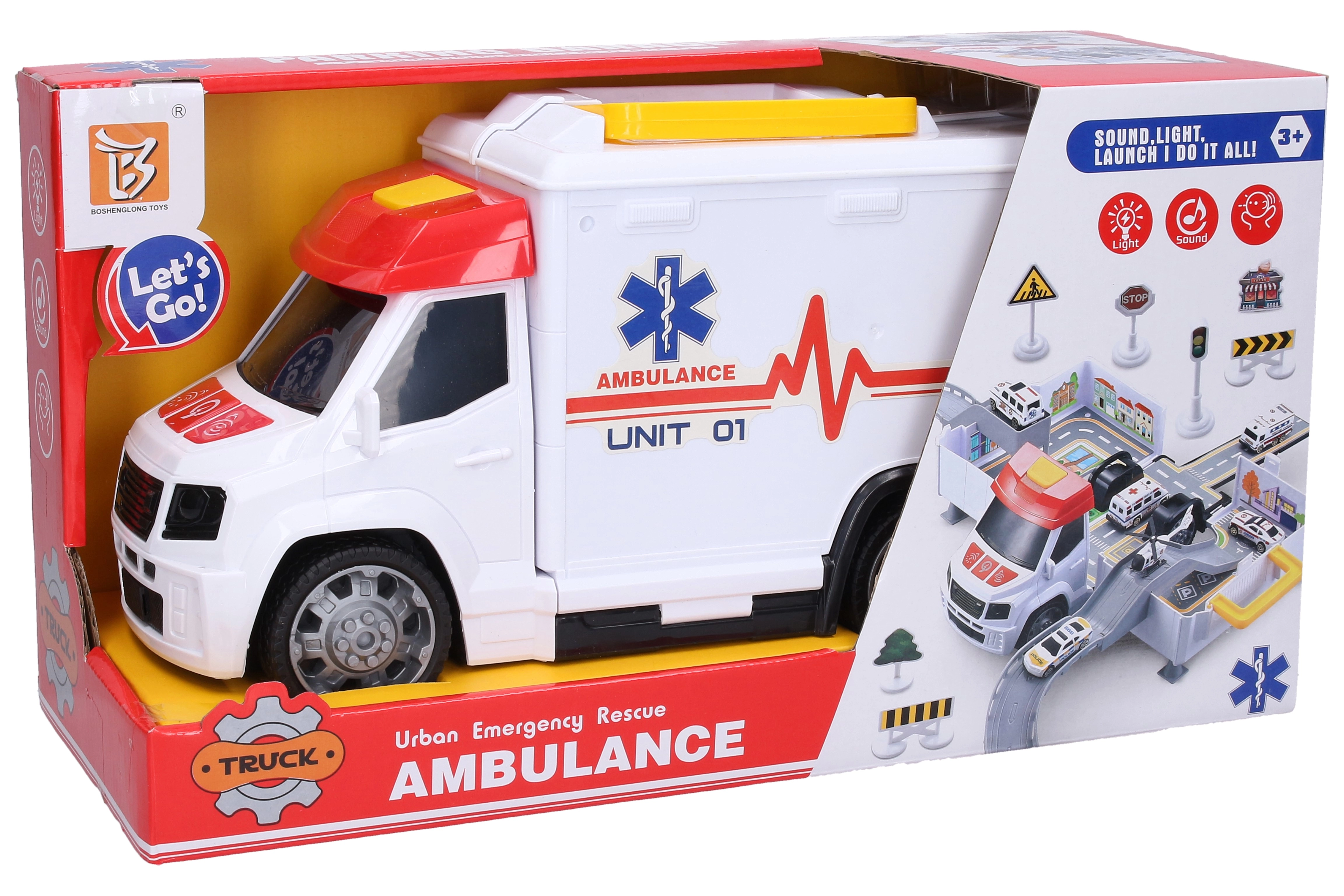 Szórakoztató és valósághű mentőautó kinyitható kórházi garázzsal, amely órákig tartó játékot kínál a gyerekeknek. Fény- és hangeffektekkel rendelkezik, aktiválás motorháztetőn lévő gombokkal és nagy tetőgombbal a nyitáshoz. A tápellátást 3× AG13 biztosítja. A szabadon futó kerekek zökkenőmentes haladást nyújtanak, szétnyitva pedig kórházi játékközpont autókkal és közlekedési táblákkal jön létre.