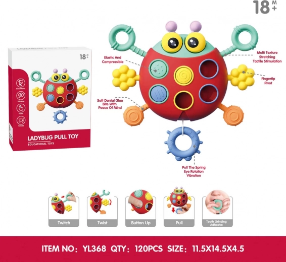 A bájos, multifunkcionális katicabogár egy szemléltető-szenzoros játék 18 hónapos kortól. Ötvözi az élénk színeket, a különböző rágcsálható textúrákat és a mozgó elemeket húzáshoz, tologatáshoz és forgatáshoz, amelyek támogatják a finommotorikát és a kognitív készségeket. A zsinór meghúzásakor a katica csörög, és mozgatja a szemeit – ideális babakocsiba, kiságyba és autóba.