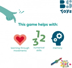 Szórakoztató és sokoldalú fa játék 4 éves kortól, amely kombinálja a színek felismerését, a számok tanulását és a mozgásos kihívásokat. Pörgesd meg a nyilat, válassz színt vagy számot, és teljesíts ötletes feladatokat – a „keress egy zöld tárgyat” feladattól a „ugorj 10×” kihívásig. Strapabíró fa elemek, 24 kétoldalas zseton és nagy forgó nyíl gondoskodik a szórakozásról 2 vagy több játékos számára, otthon és a szabadban is.