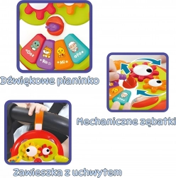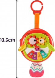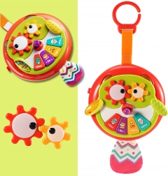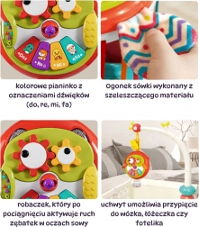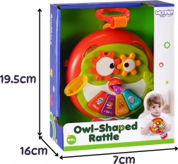 A WOOPIE márka aranyos, felakasztható baglya ötvözi a szórakozást és a tanulást a legkisebbek számára. Színes zongorát kínál (do, re, mi, fa) lágy dallamokkal, zörgő szárnyakat, mechanikus fogaskerekeket a szemekben, amelyeket egy húzható „kukac” aktivál, valamint egy susogó farkat. A praktikus rögzítőnek köszönhetően könnyen feltehető babakocsira, kiságyra vagy autósülésre.