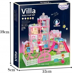 - Gazdag, 275 darabos készlet: összeépíthető ház, baba, kutyus, kert kerítéssel és kapuval, asztal és székek, kanapé, ágy, szekrény, hűtőszekrény, lépcső, csúszda és további elemek.
